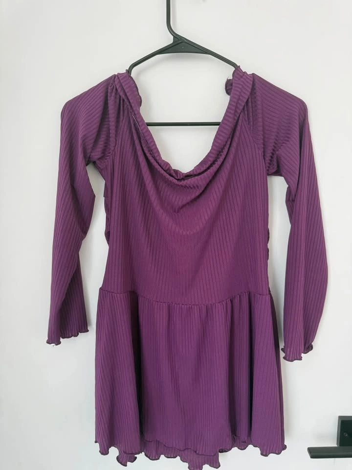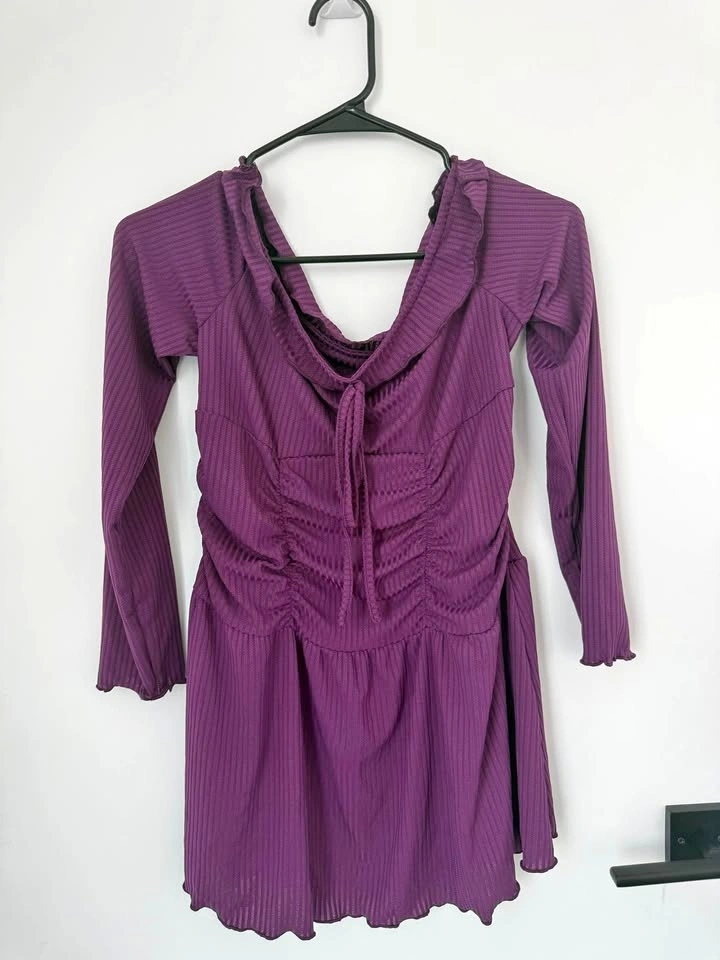 Cute purple dress. Ribbed material. Long sleeves with ruffled cuffs. Front has cool ruched detail with a drawstring. Bottom hem also ruffled. Super comfy.