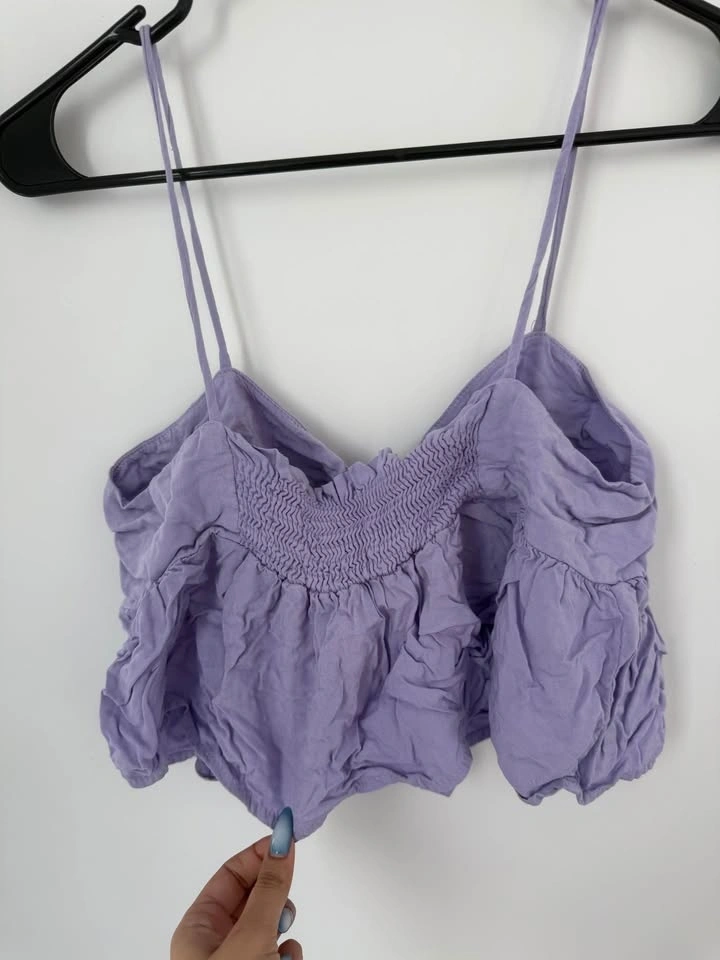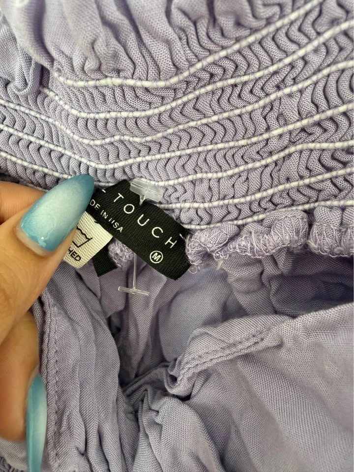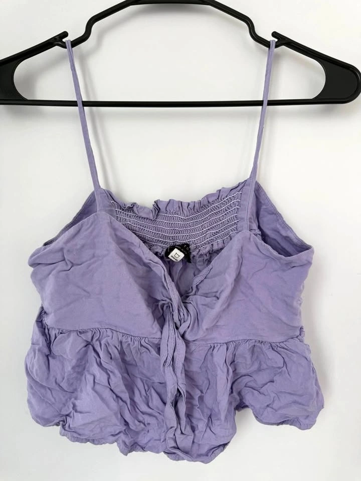Stylish lavender crop top from TOUCH, size M. Features a smocked bodice and a tie front detail. It has spaghetti straps and a ruffled hem. Perfect for summer!