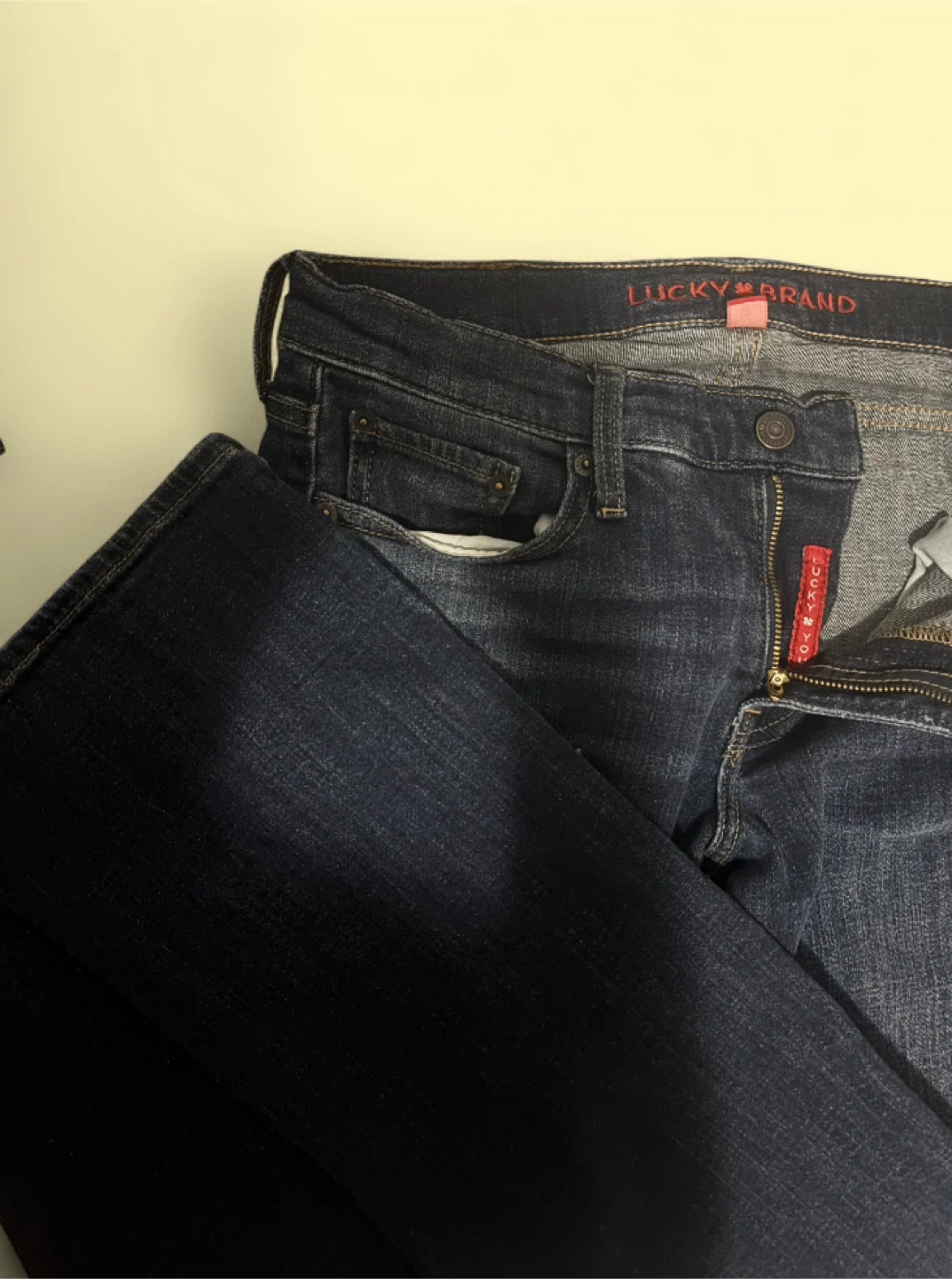 Lucky Brand women's jeans in a dark wash. Classic denim material. These jeans are a stylish staple for any wardrobe! #lucky#2000s