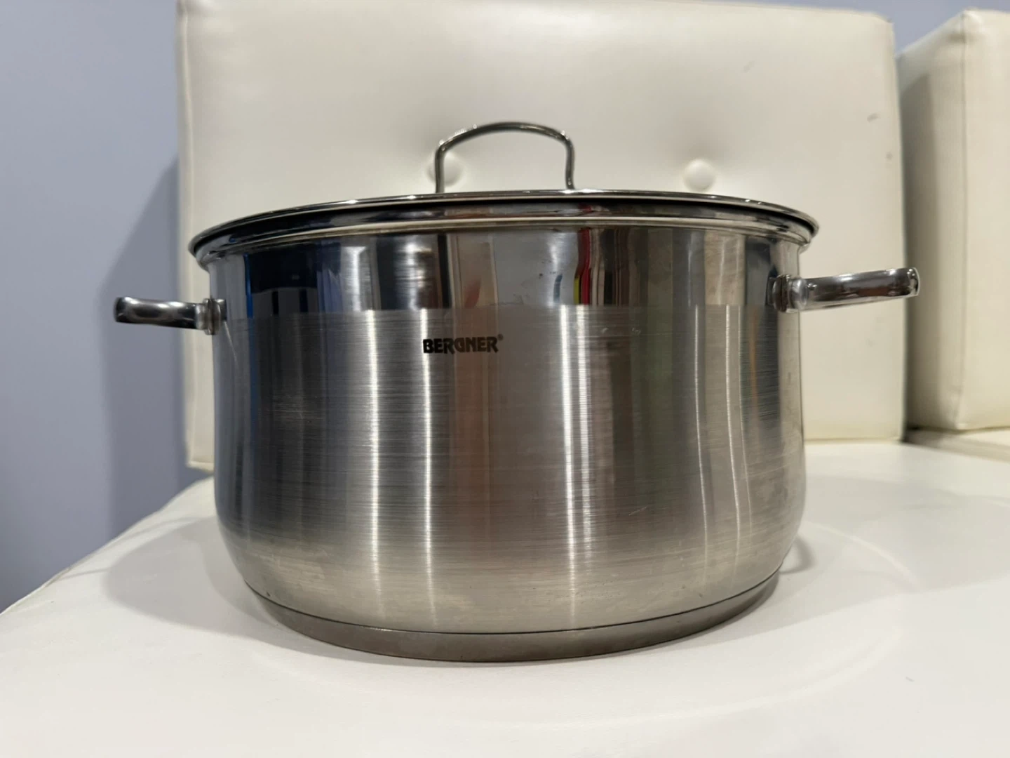 This is a Bergner stainless steel pot. It comes with a clear glass lid with a handle. The pot has sturdy side handles for easy carrying. It's suitable for various cooking tasks in the kitchen.