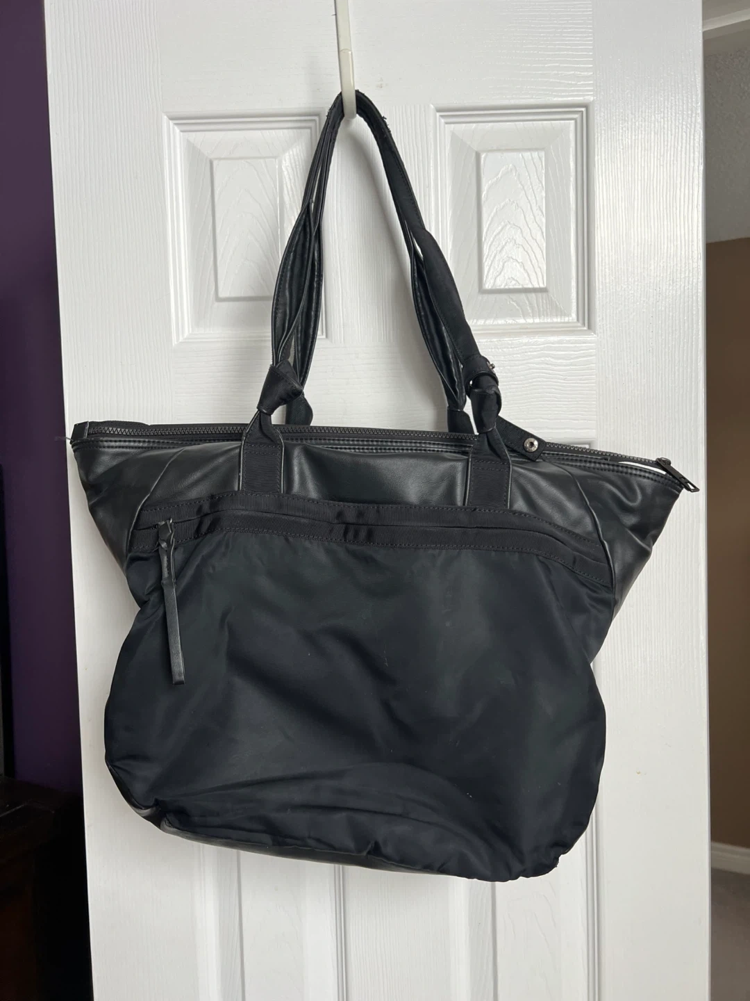 This Lululemon duffel bag is black with leather-like accents. It has a zippered main compartment and a front zippered pocket. Great for everyday use or gym trips!