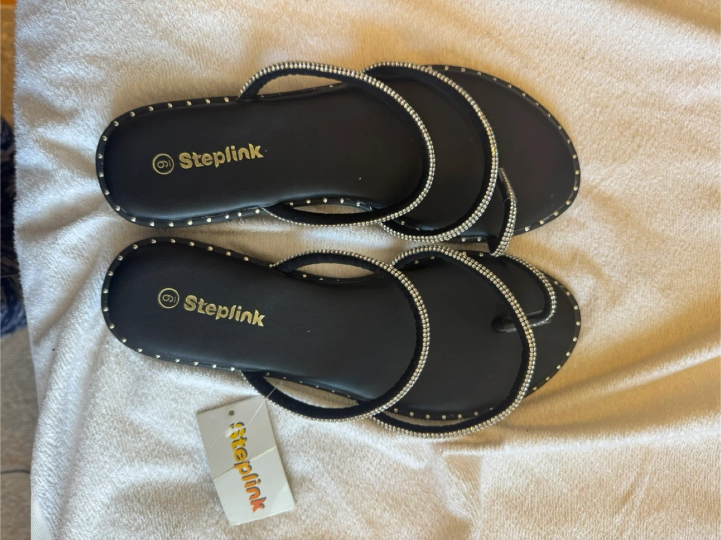 These Steplink thong sandals are black with sparkling rhinestone embellishments. They're a size 6. Perfect for adding some flair to a casual outfit!