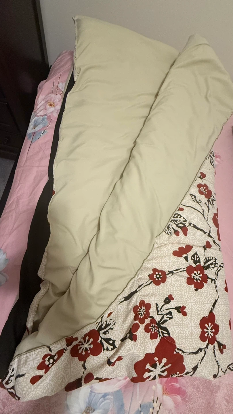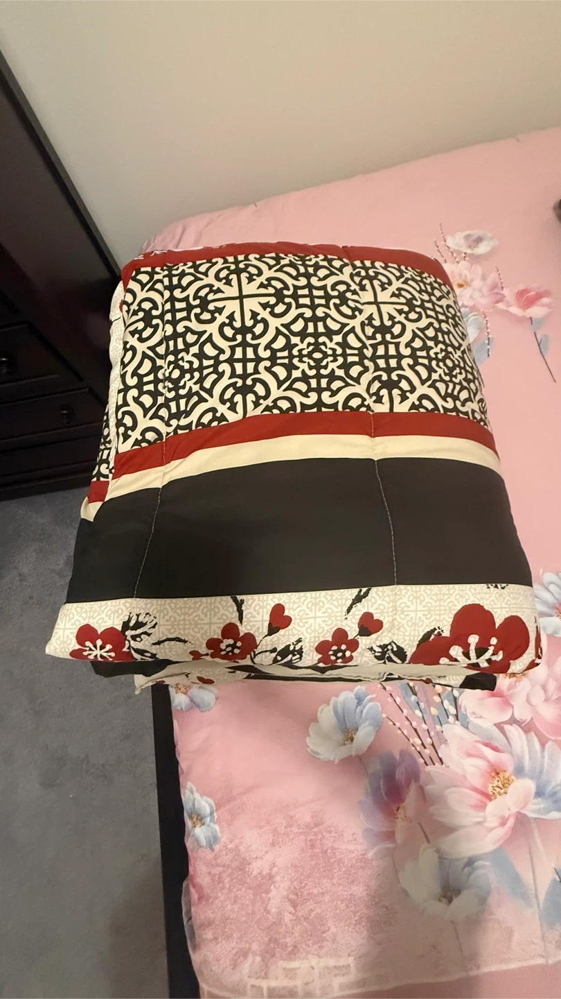 This queen size comforter features a stylish patterned design with red, black, and cream accents. It includes a matching pillowcase. It's made with a polyester fill for comfortable warmth. A great addition to refresh your bedroom decor!