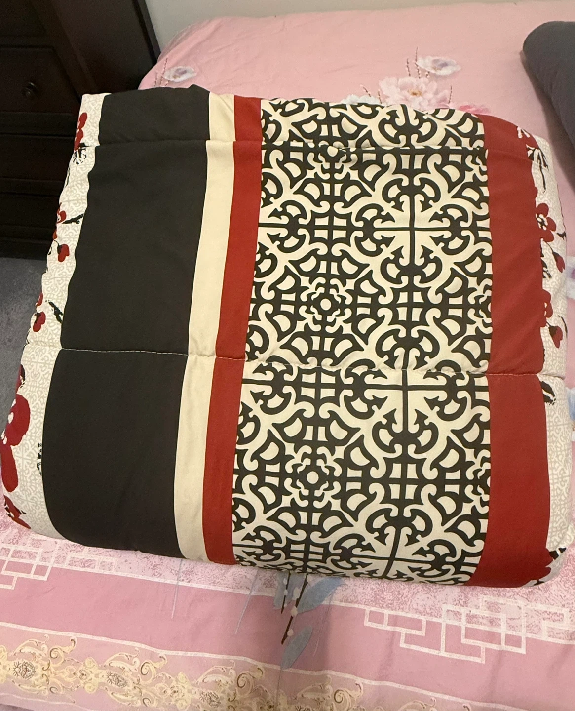 This queen size comforter features a stylish patterned design with red, black, and cream accents. It includes a matching pillowcase. It's made with a polyester fill for comfortable warmth. A great addition to refresh your bedroom decor!