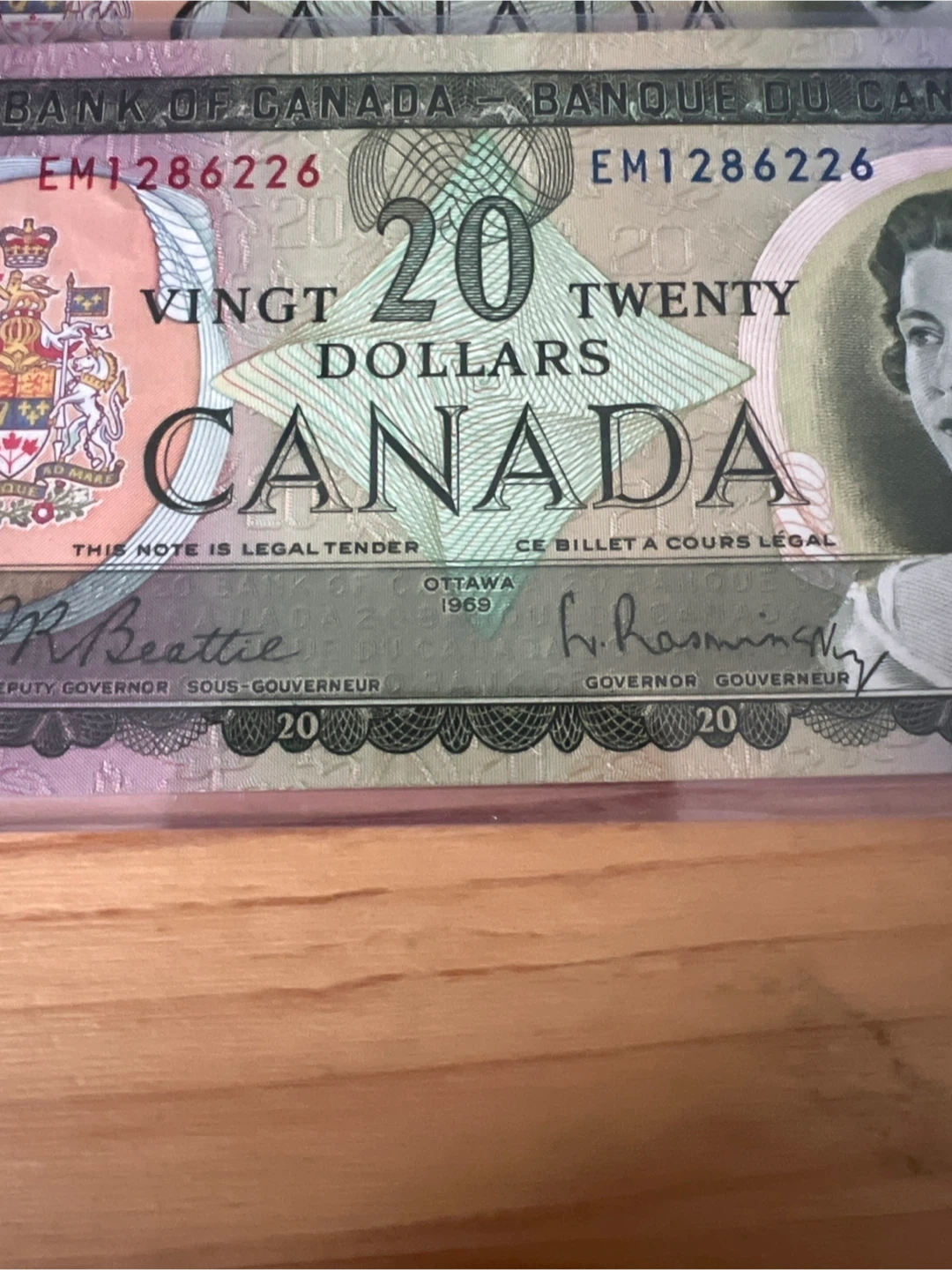 1969 Canadian twenty-dollar bills. Each note features Queen Elizabeth II on one side and the Canadian Rockies on the other. 60$ each or 260$ for 5. they all come with a protective sleeve.