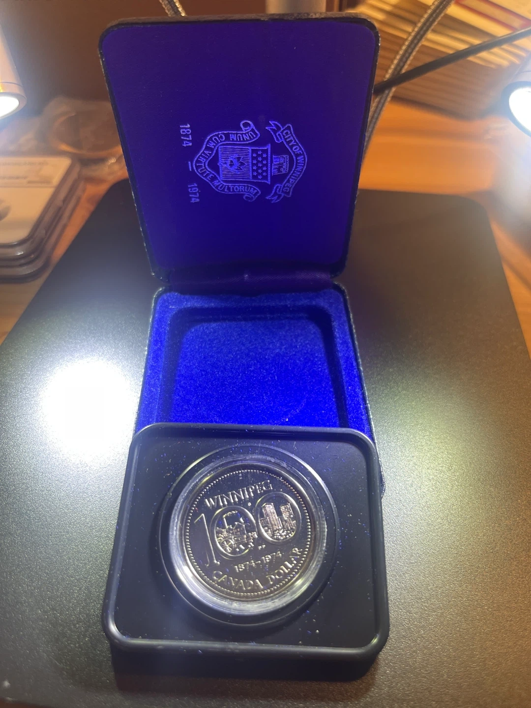 1974 Winnipeg 100 dollars coin. Comes in original box and presentation case. Features the Royal Coat of Arms of Canada.