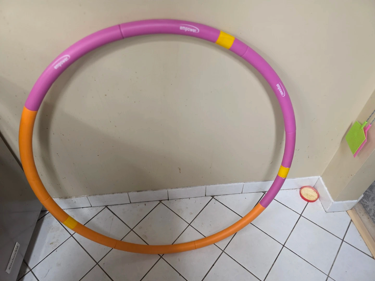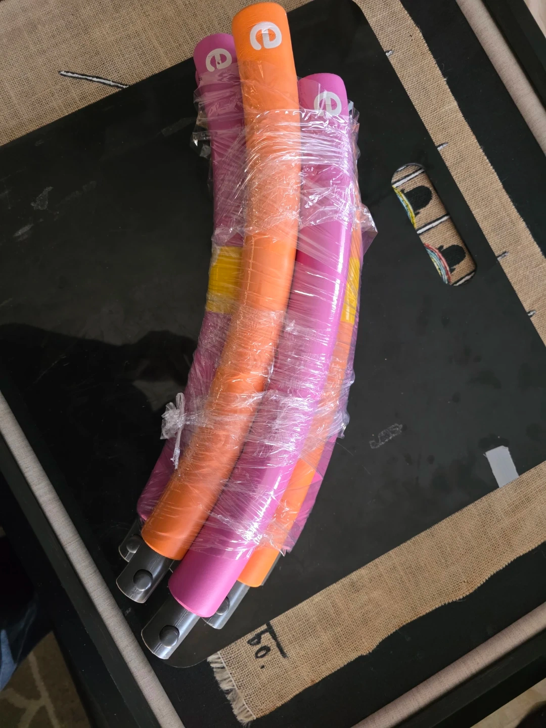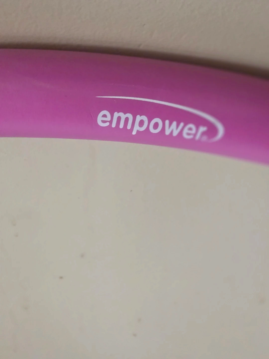 This is an Empower Fitness weighted hula hoop, designed for exercise. It comes in sections for easy assembly. The hoop's colour combination is pink and orange.