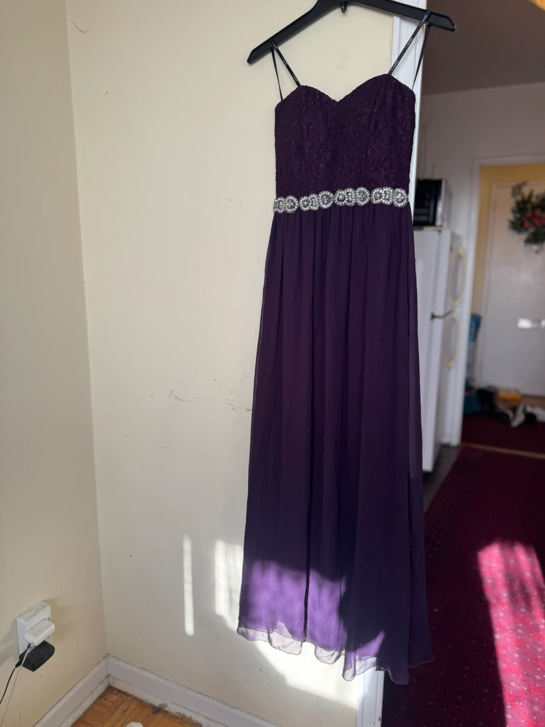 This lot includes three women's dresses. One is a long-sleeved black maxi dress with beaded neckline and cuffs. Another is a black sleeveless formal dress with a draped satin bodice. The third is a purple floor-length dress with a lace bodice and embellished waistband. All are suitable for formal events.