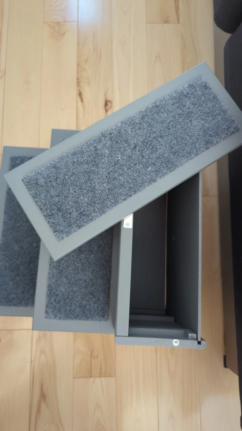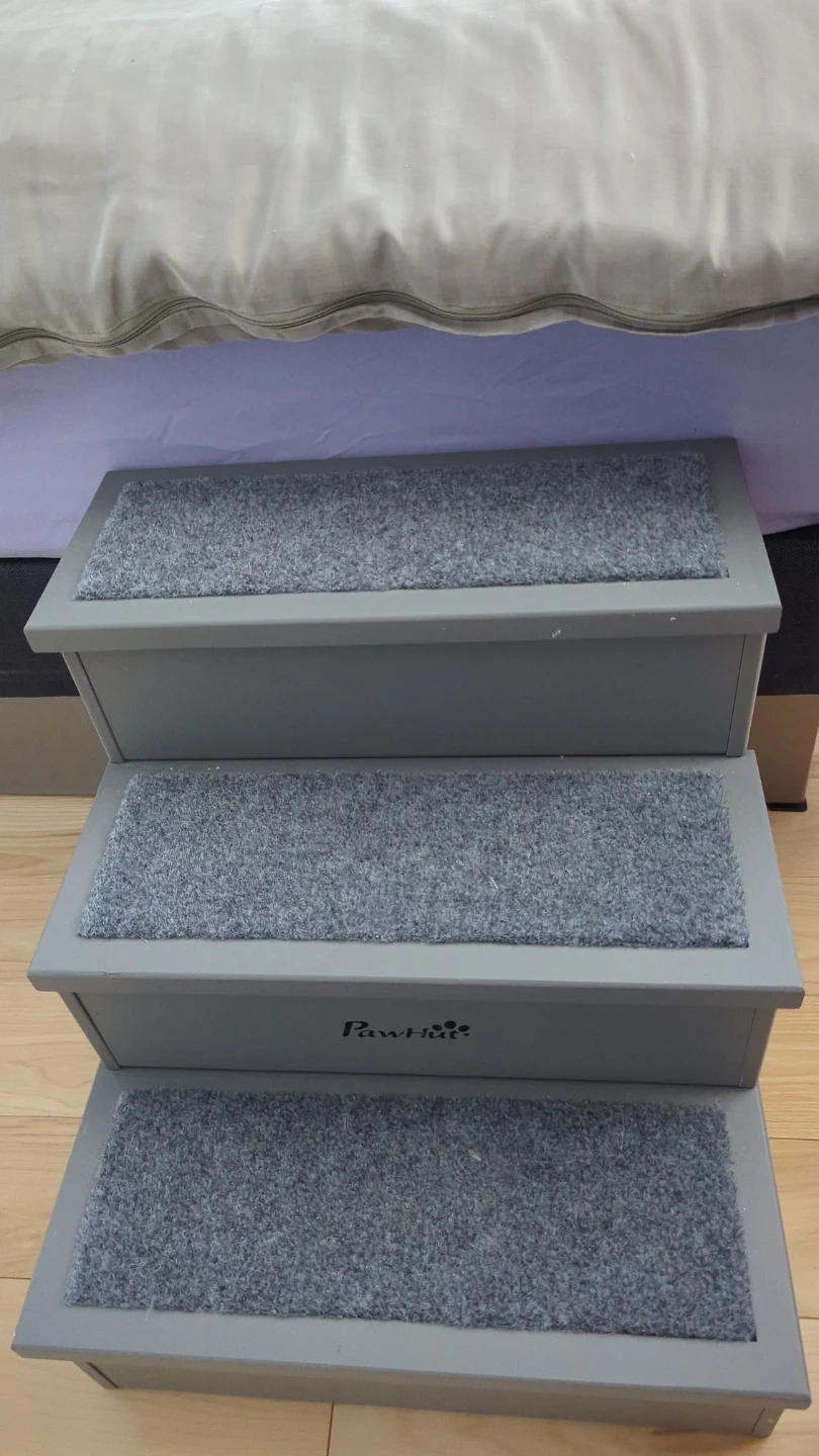 PawHut 3-step pet stairs in grey, with toy storage! These steps are carpeted for traction. They help pets reach elevated surfaces like beds or couches. Great for older pets or those with mobility issues!