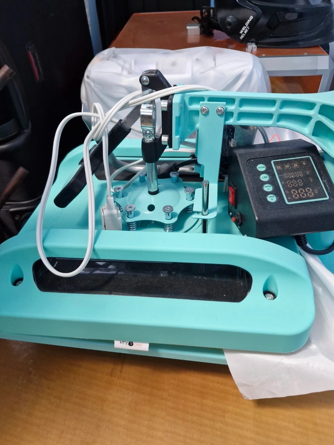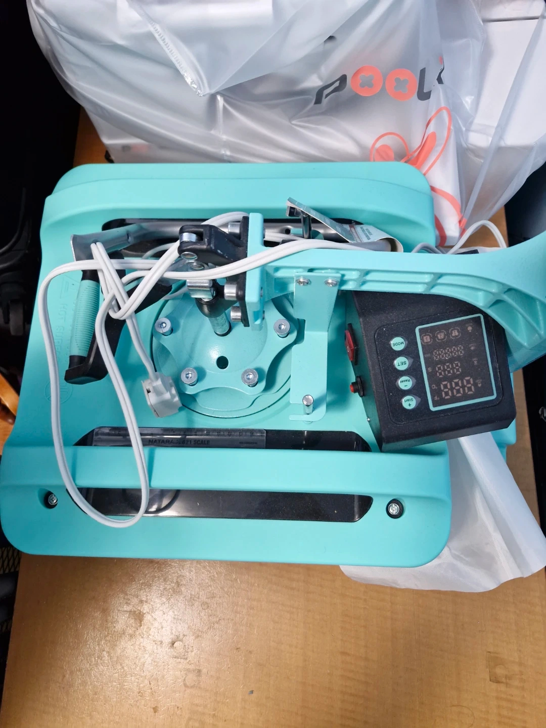 This is an aqua-coloured heat press machine for applying transfers. It features a digital display for temperature and time control. A teal handle is present for operation. It's compact and ready for crafting projects!