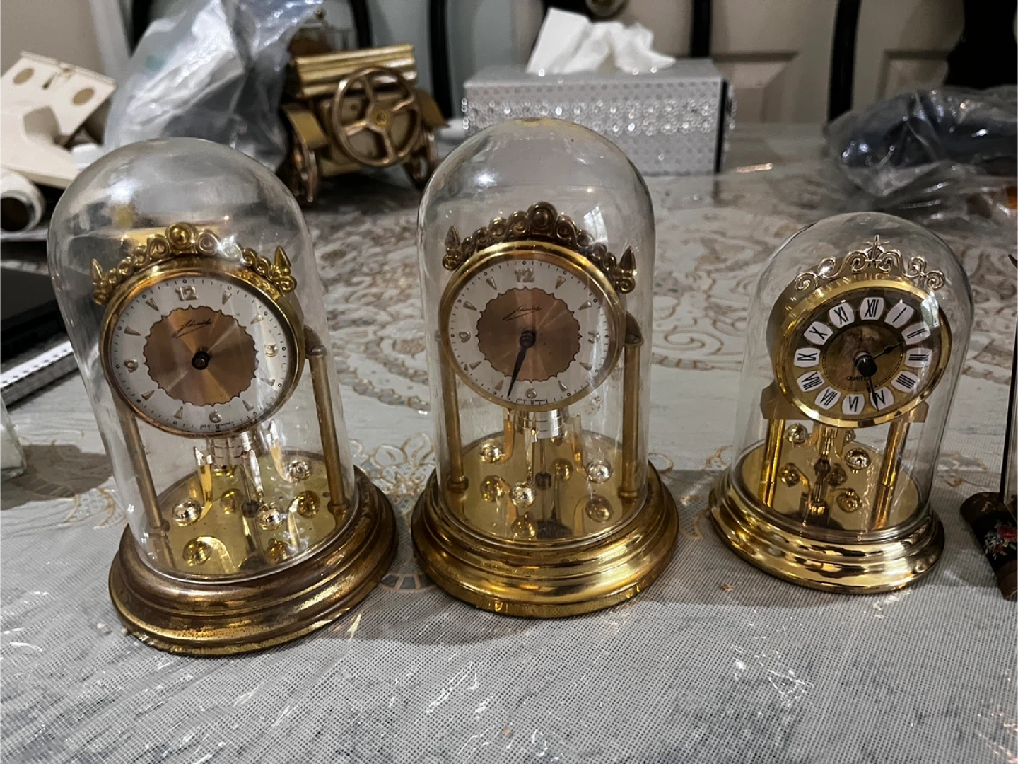 This is a vintage Schatz 8-day mantel clock with a brass and glass casing. It features a decorative dial with floral accents and a visible pendulum mechanism. The clock is in a classic design, perfect for adding a touch of vintage charm to any room.
