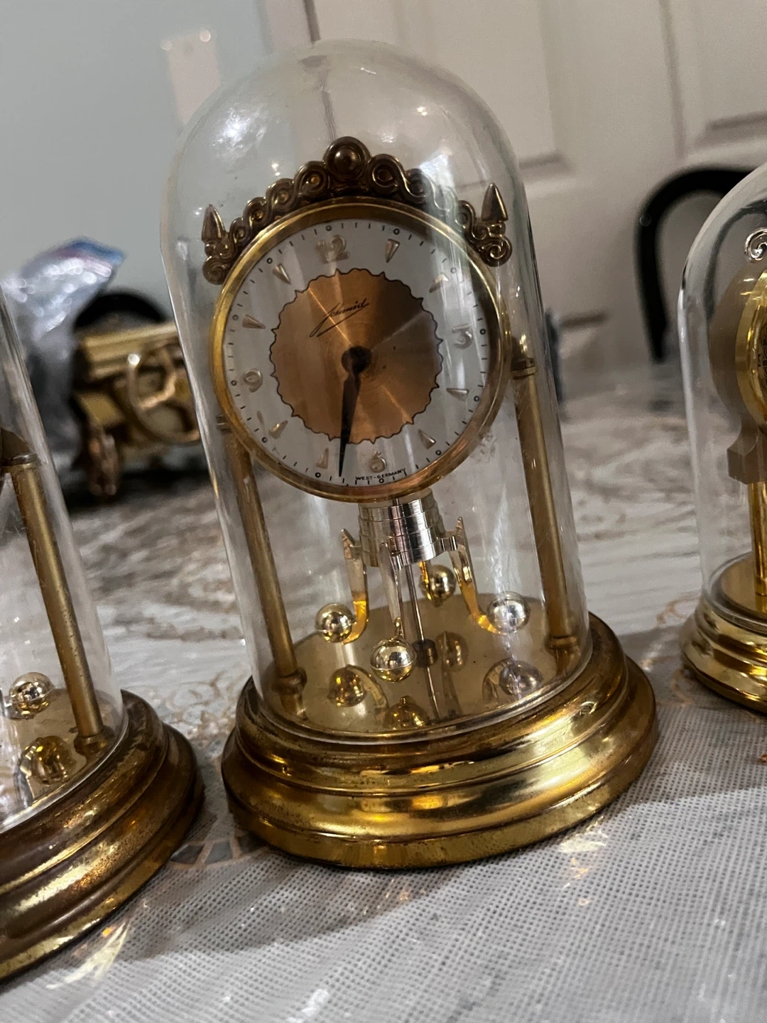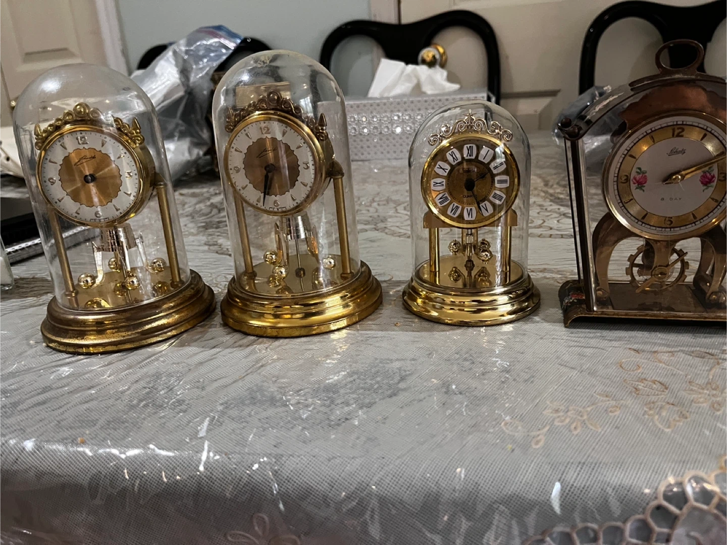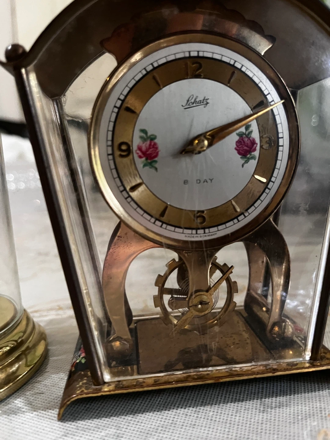 This is a vintage Schatz 8-day mantel clock with a brass and glass casing. It features a decorative dial with floral accents and a visible pendulum mechanism. The clock is in a classic design, perfect for adding a touch of vintage charm to any room.