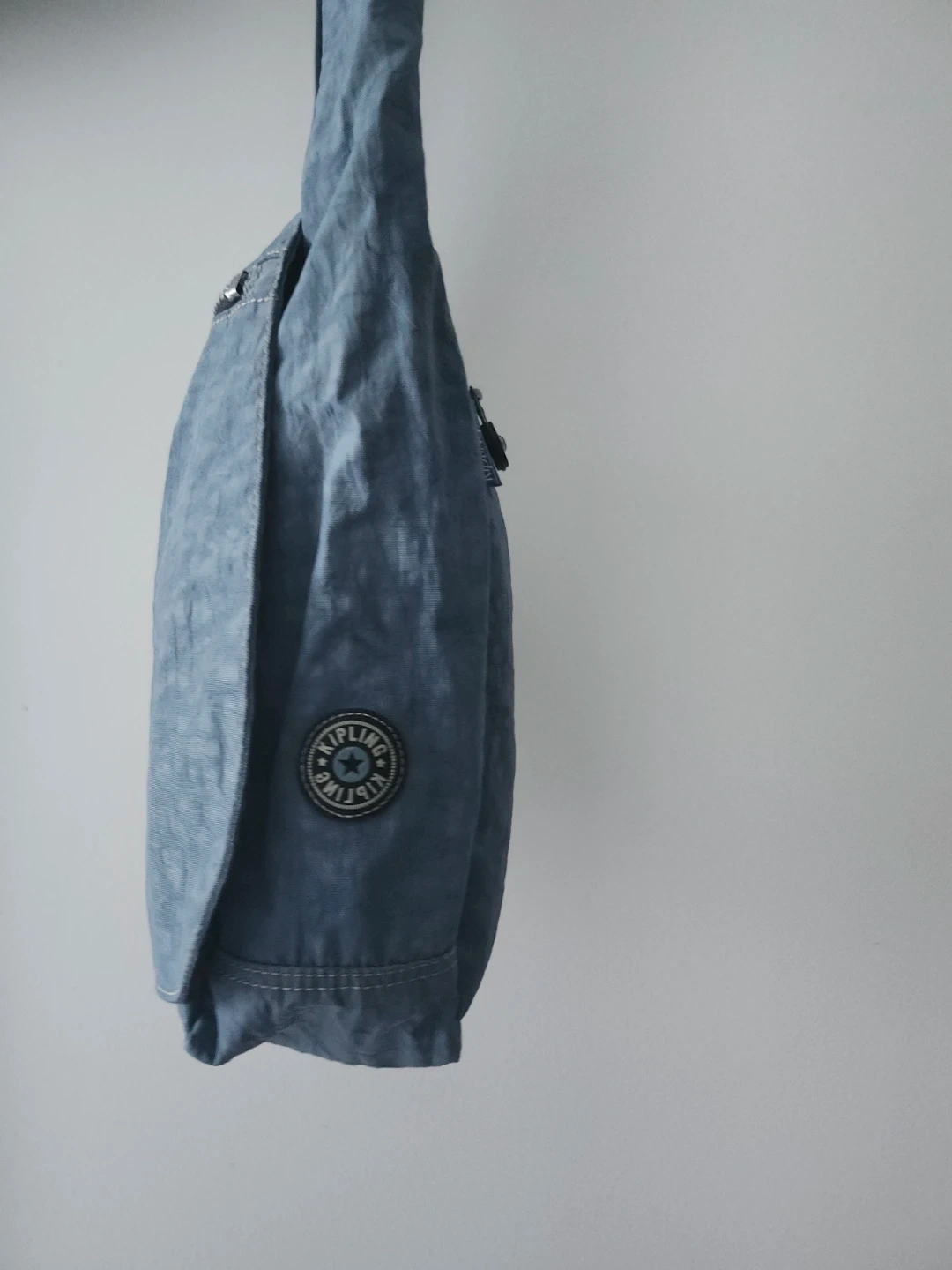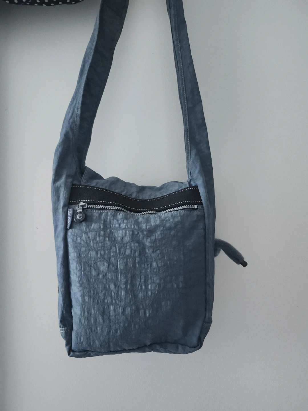 A Kipling shoulder bag in a blue, crinkled nylon material. It features a zippered main compartment and an exterior zippered pocket. Includes the signature Kipling monkey charm. This bag is lightweight and practical for everyday use.