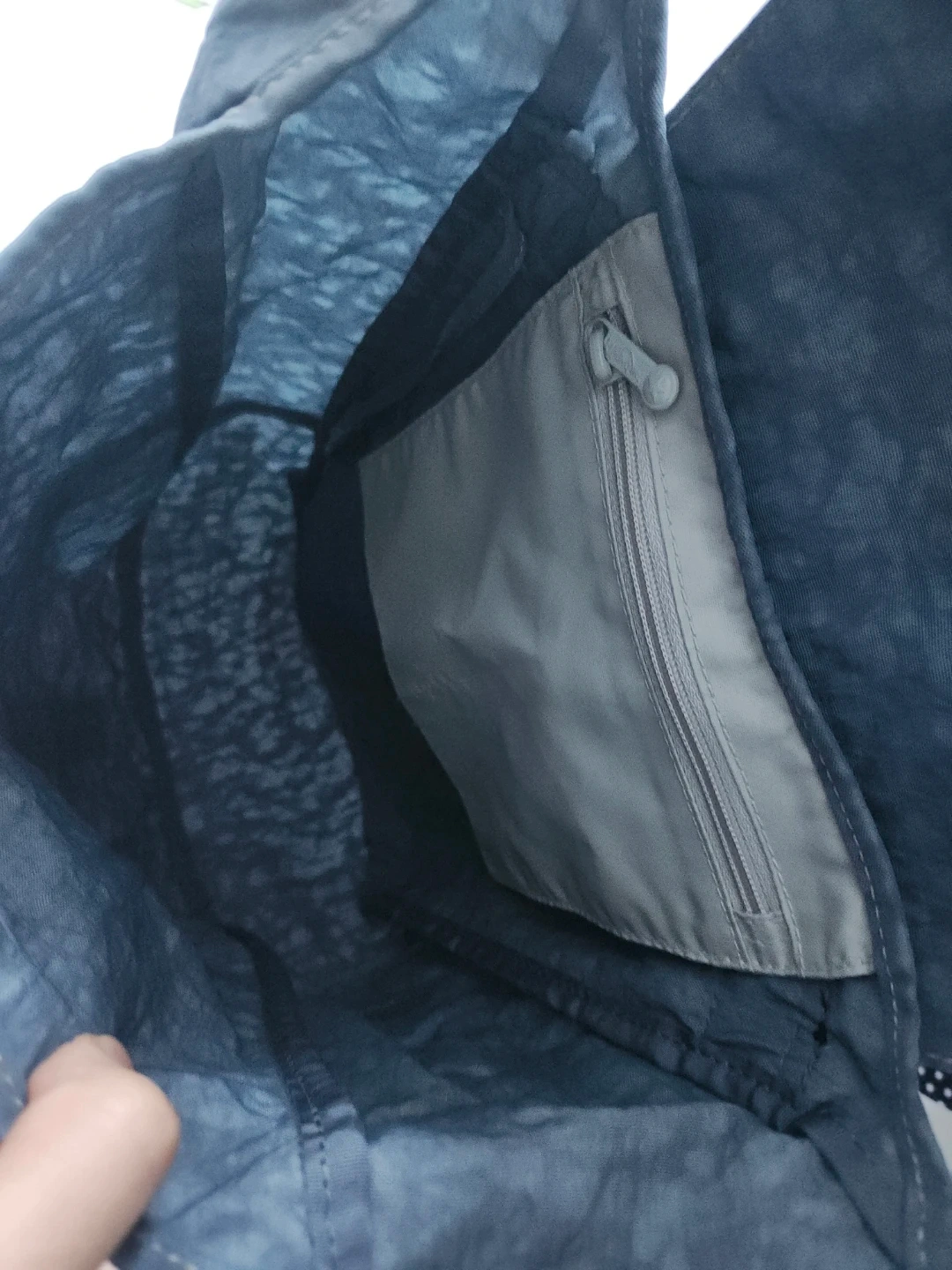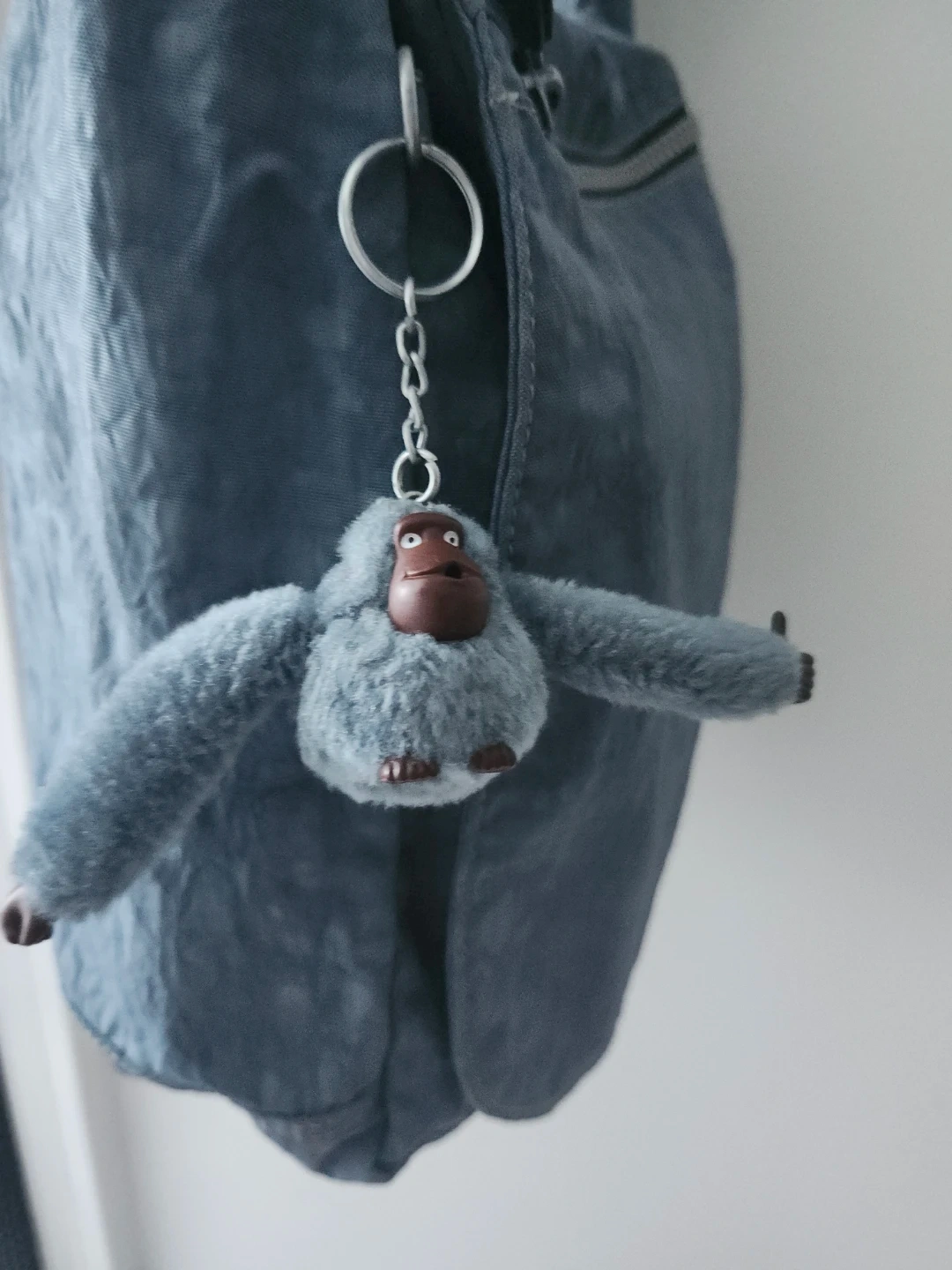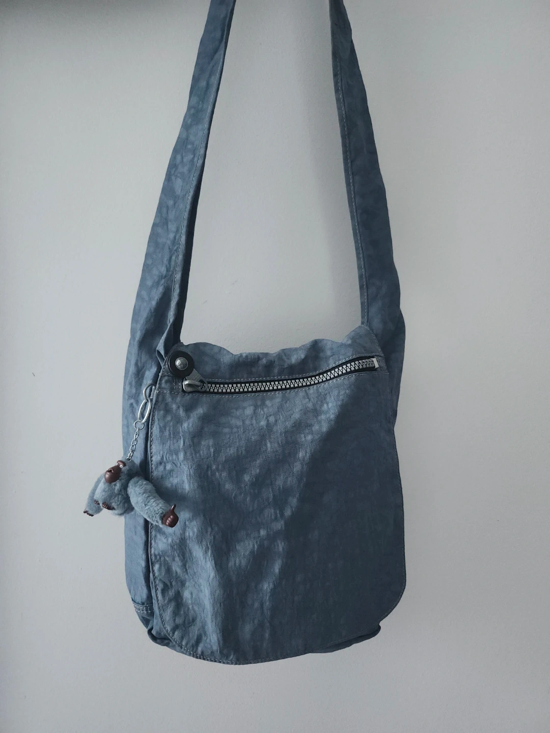 A Kipling shoulder bag in a blue, crinkled nylon material. It features a zippered main compartment and an exterior zippered pocket. Includes the signature Kipling monkey charm. This bag is lightweight and practical for everyday use.