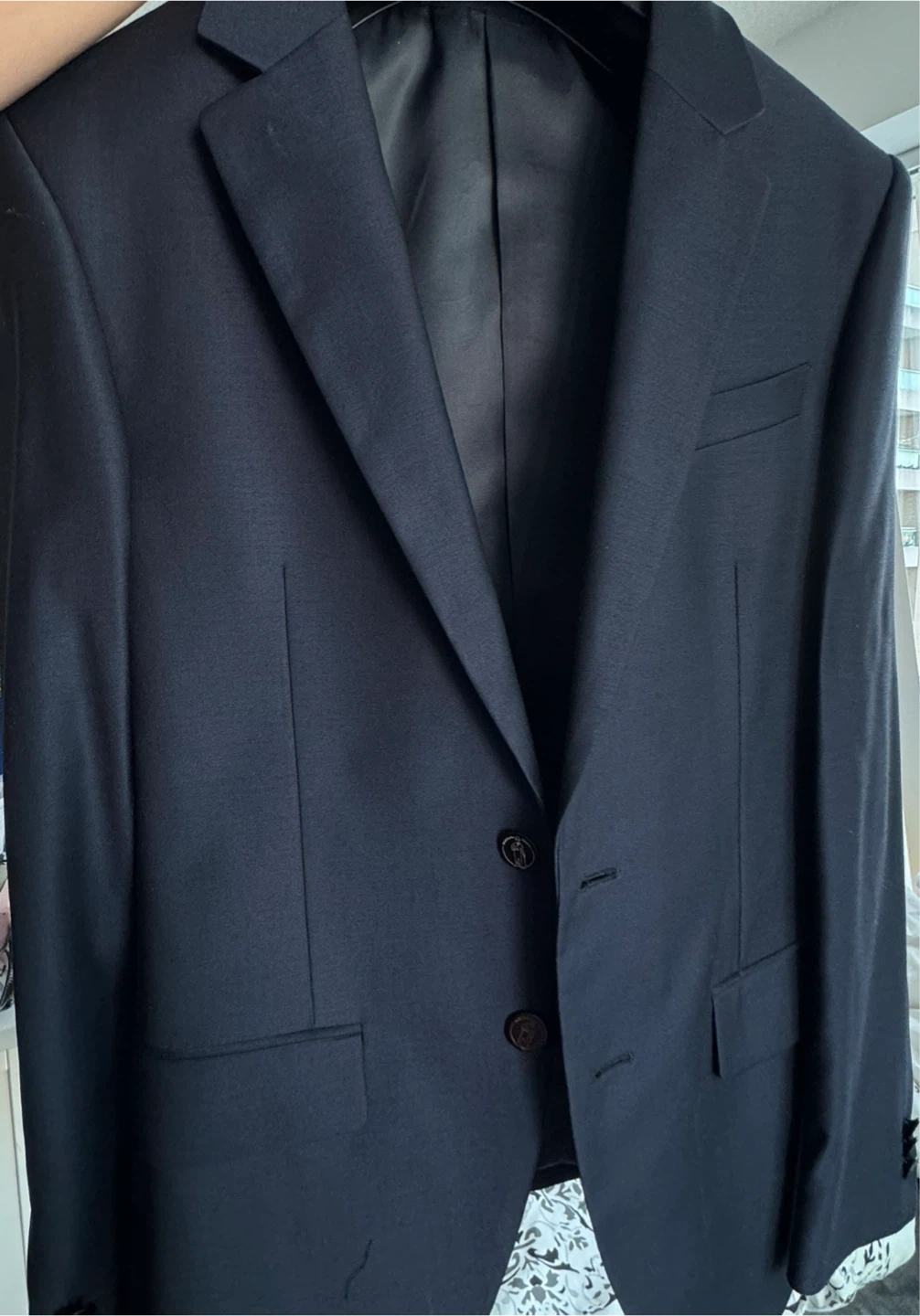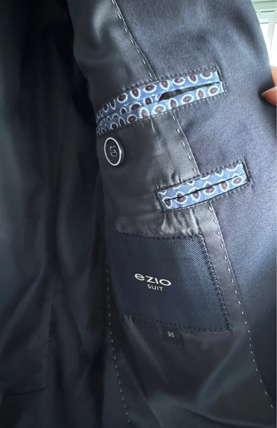 This is a navy blue Ezio suit jacket and matching pants. The jacket features a classic two-button closure and detailed inner lining.