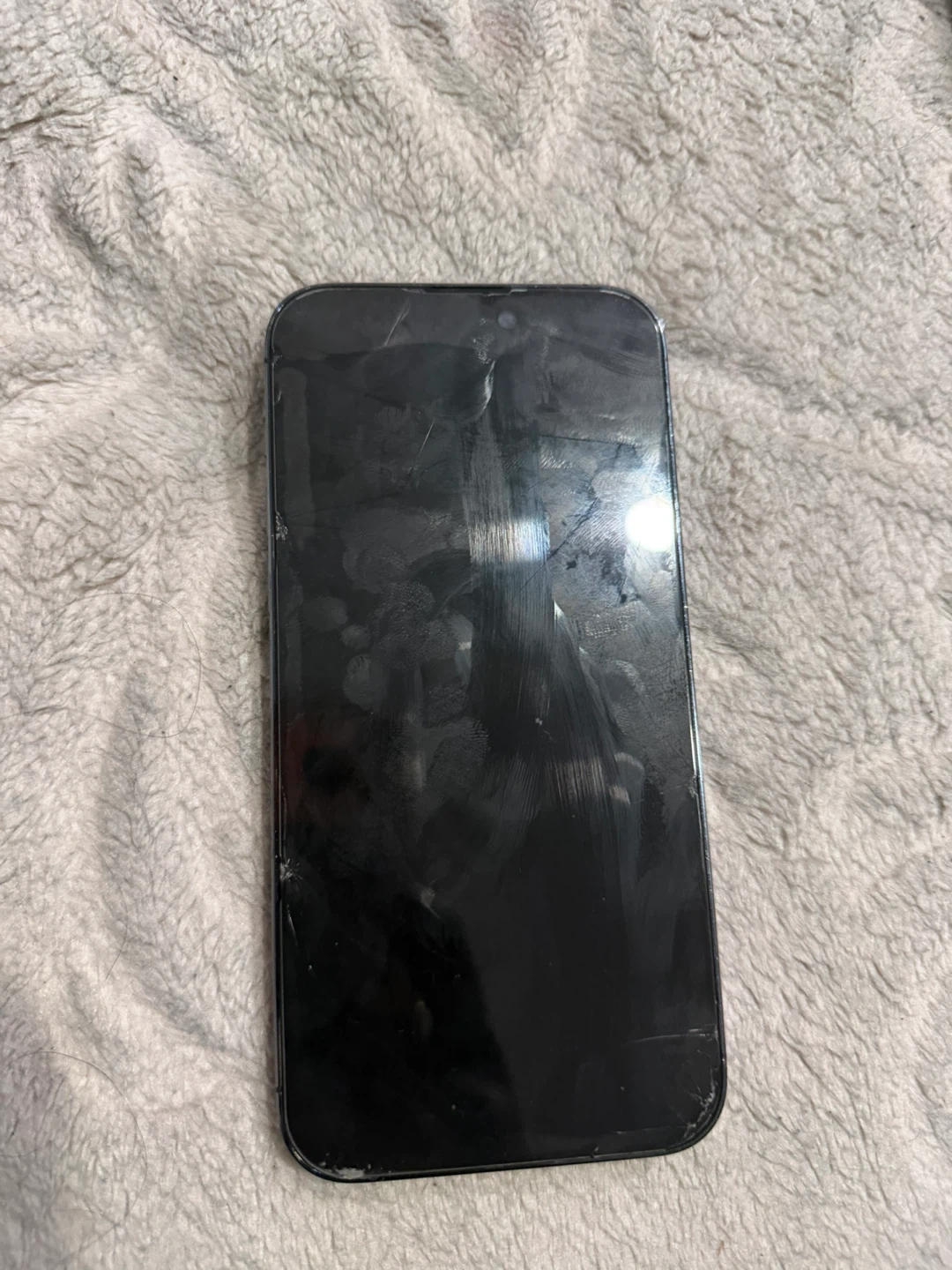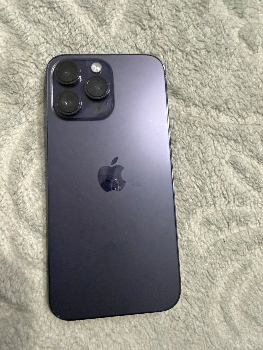 This is an Apple iPhone 14 Pro in a dark purple colour. It's a smartphone with a powerful camera system and a sleek design. The screen is a vibrant display, perfect for all your apps and media.