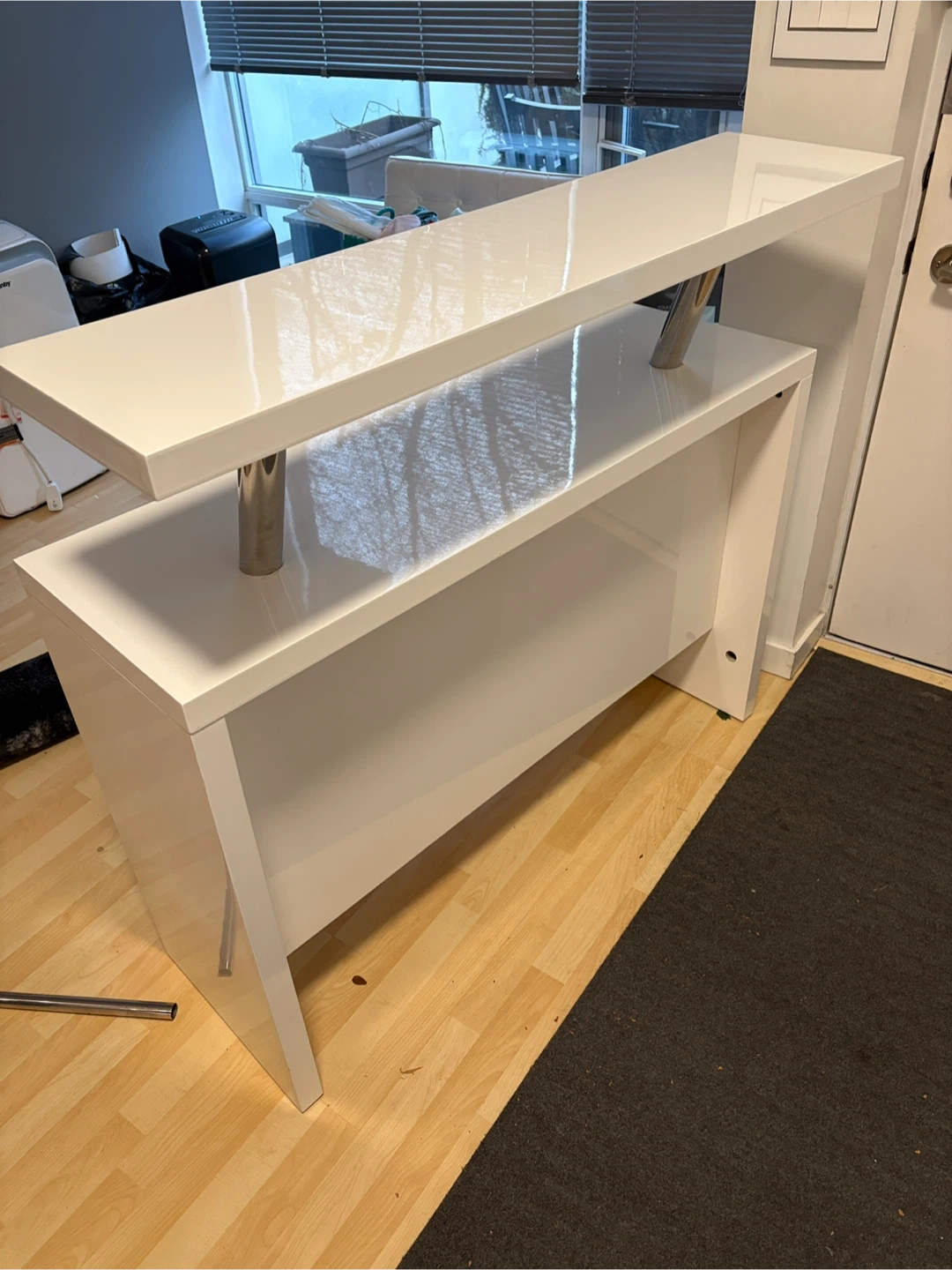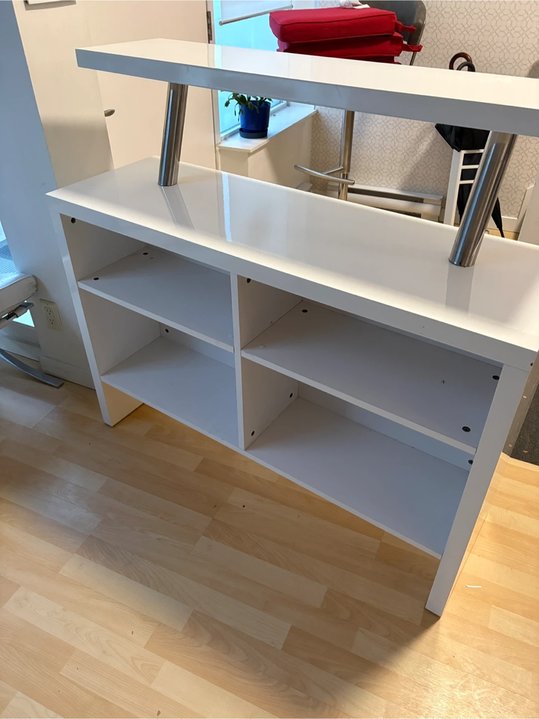 This bar unit features a sleek white high gloss finish with modern chrome accents. It offers ample storage with its open shelving compartments. Its contemporary design makes it a stylish addition to any entertainment space.