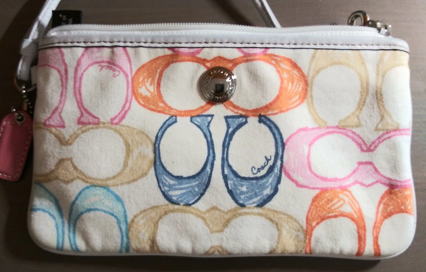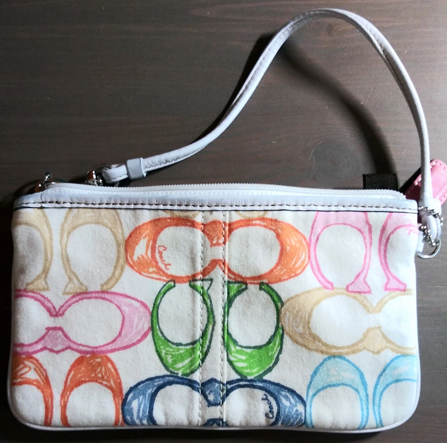 Selling a cute Coach wristlet pouch! It features the classic Coach logo design in a variety of colours. Perfect for carrying your essentials in style. It's in great condition and ready for a new home!