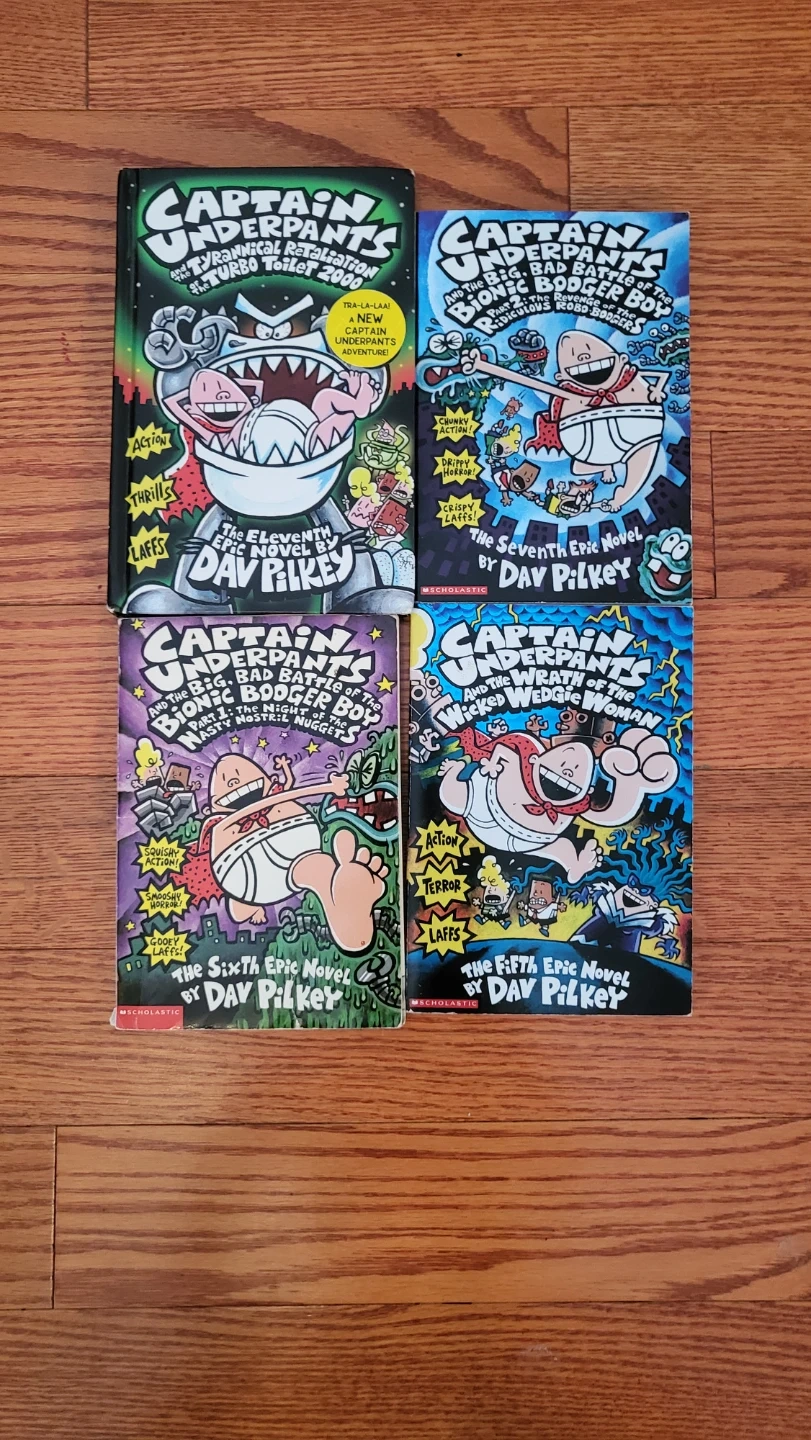 This is a set of four Captain Underpants books by Dav Pilkey. It includes 'The Tyrannical Retaliation of the Turbo Toilet 2000', 'The B.I.G. Bad Battle of the Bionic Booger Boy Part 2: The Revenge of the Ridiculous Robo-Bodgers', 'Part 1: The Night of the Nasty Nostril Nuggets', and 'The Wrath of the Wicked Wedgie Woman'. These books are great for young readers.