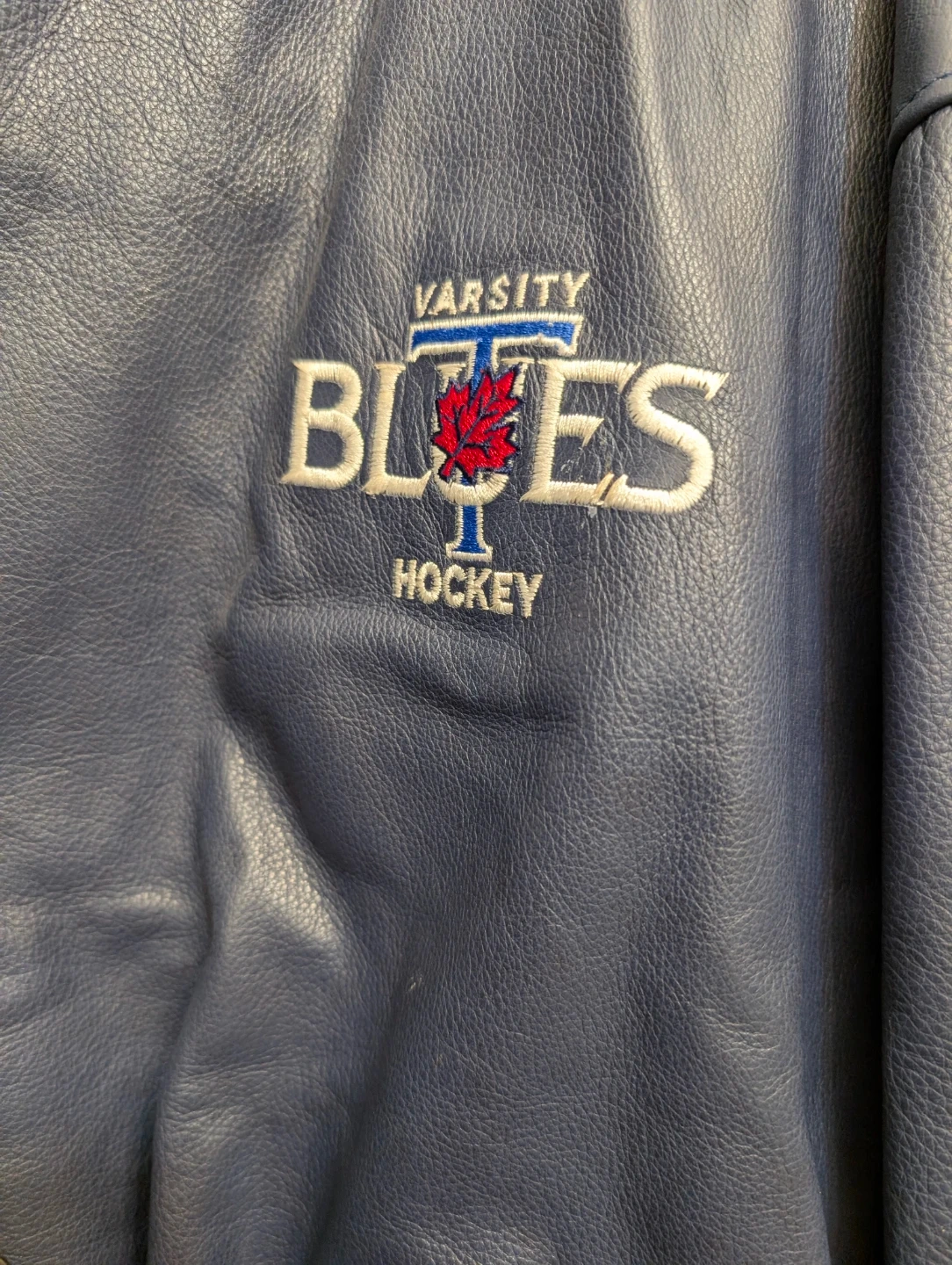 Large-XL Navy blue leather varsity jacket with Roots Sporting Goods logo on the left chest. Back features Varsity Blues Hockey embroidery. A classic bomber style with snap button closure and ribbed cuffs and hem. Made for hockey fans!