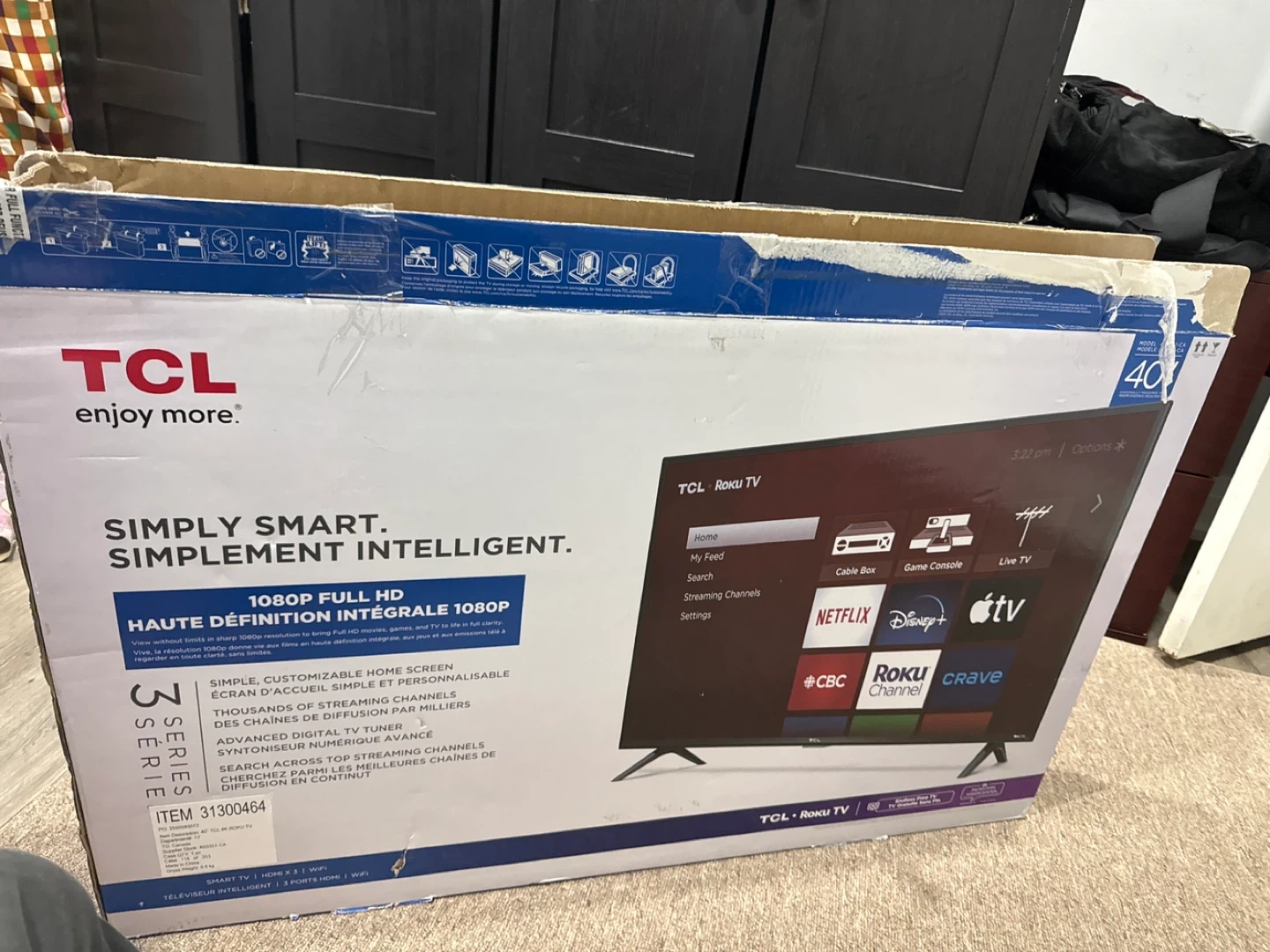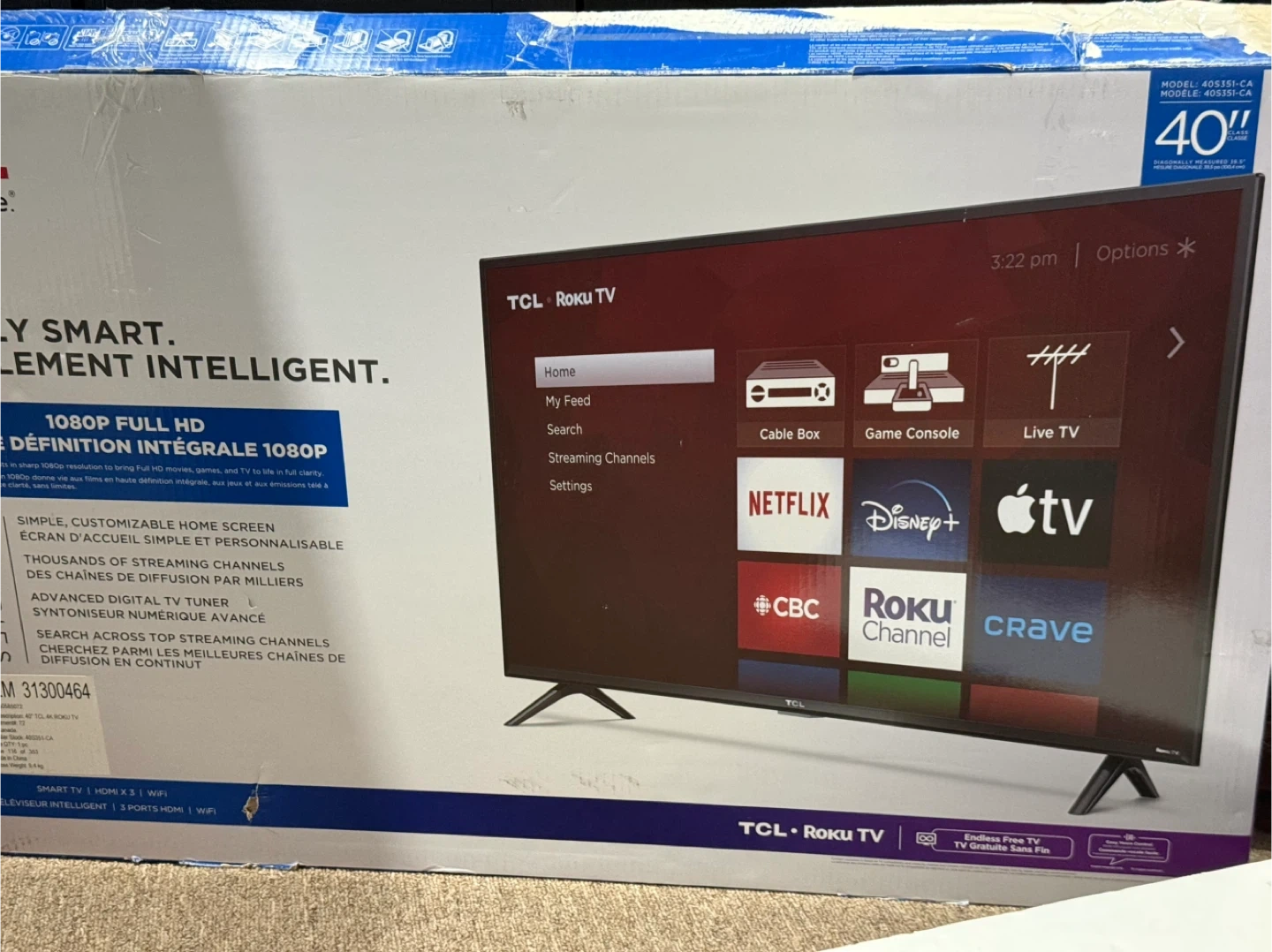 Brand new TCL 40-inch Roku Smart TV. Never used. Box opened only for photos. TV has not been set up or powered on. Features Full HD 1080p picture quality and built-in Roku Smart TV for easy access to streaming apps like Netflix, Disney+, YouTube, Crave, CBC, Apple TV, and more. Details: • Brand: TCL • Size: 40” class • Resolution: 1080p Full HD • Smart TV: Roku TV built-in • Wi-Fi enabled • Multiple HDMI and USB ports • Works with cable boxes, gaming consoles, and streaming devices • Original box included Condition: ✔ Brand new ✔ Never used ✔ No damage Pickup: Local pickup only Cash preferred