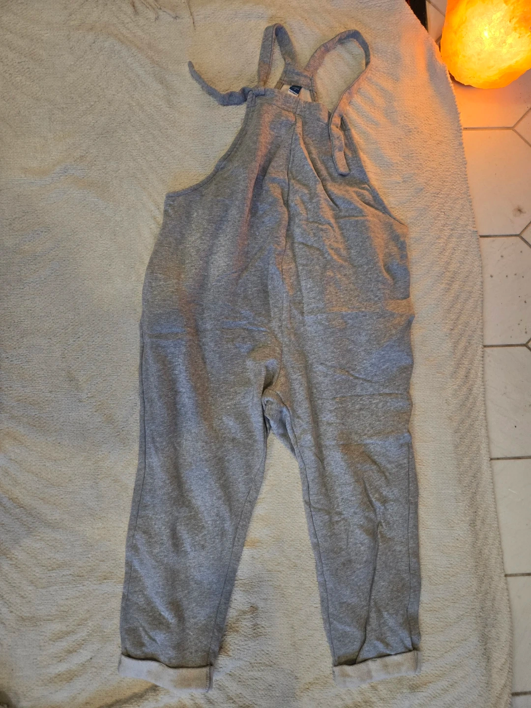 Worn twice — practically new. Grey cotton overalls with adjustable tie straps. A warm & easy maternity piece with lots of room for your growing belly.