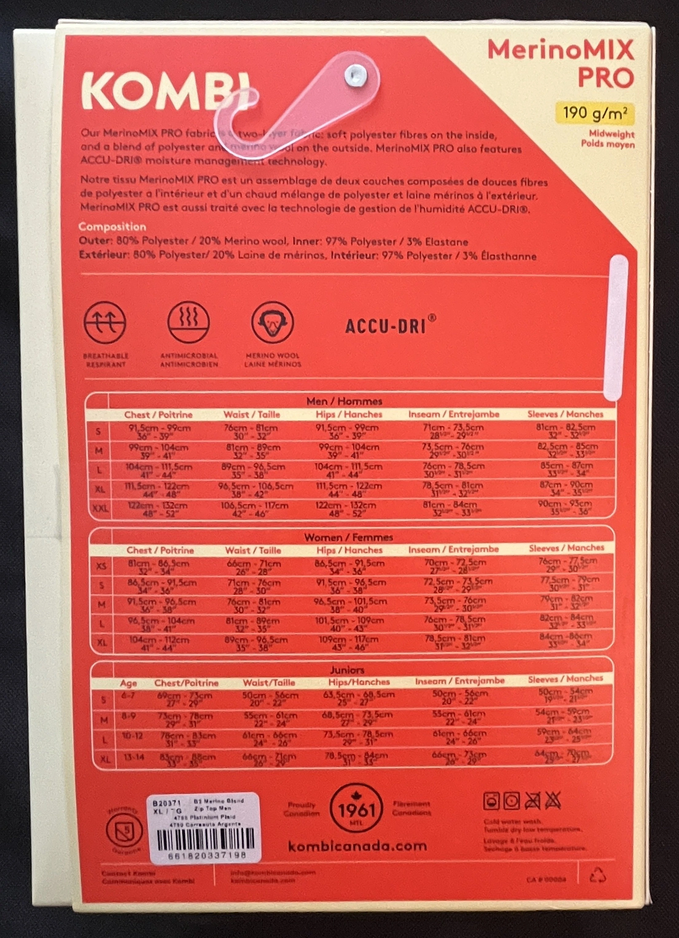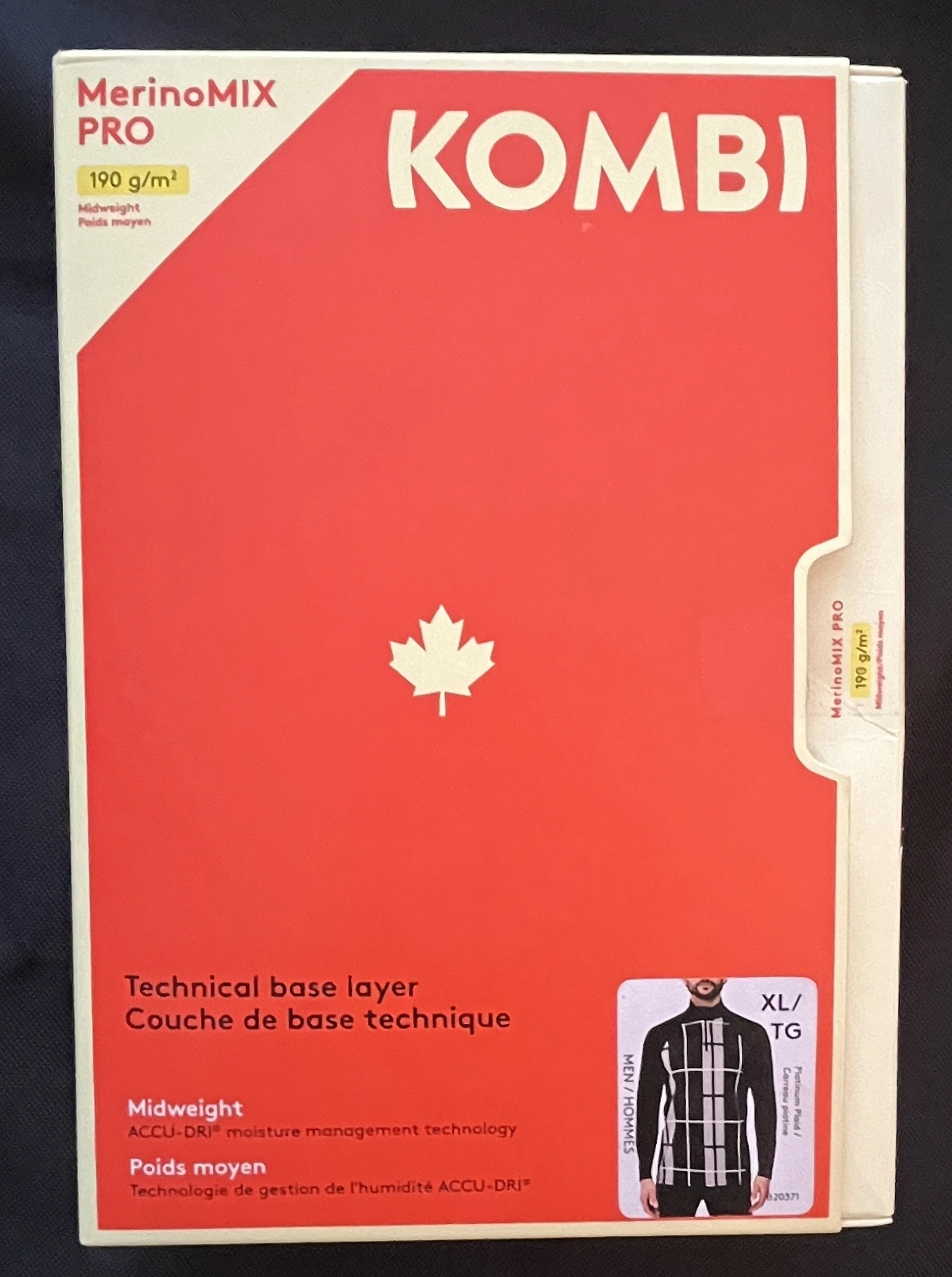 I'm selling a brand new Kombi MerinoMIX PRO technical base layer for men in size XL. It's a lightweight base layer made with Merino wool and ACCU-DRI moisture management technology. The outer layer is 80% polyester and 20% Merino wool, while the inner layer is 97% polyester and 3% elastane.
