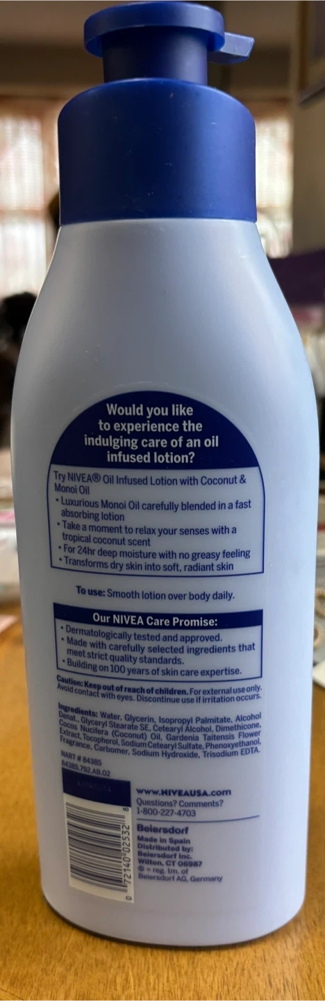 Nivea Oil Infused Lotion with Coconut Scent & Monoi Oil. Absorbs quickly and transforms dry skin into beautifully nourished skin. 16.9 FL. OZ. 500 mL. Dermatologically tested and approved.