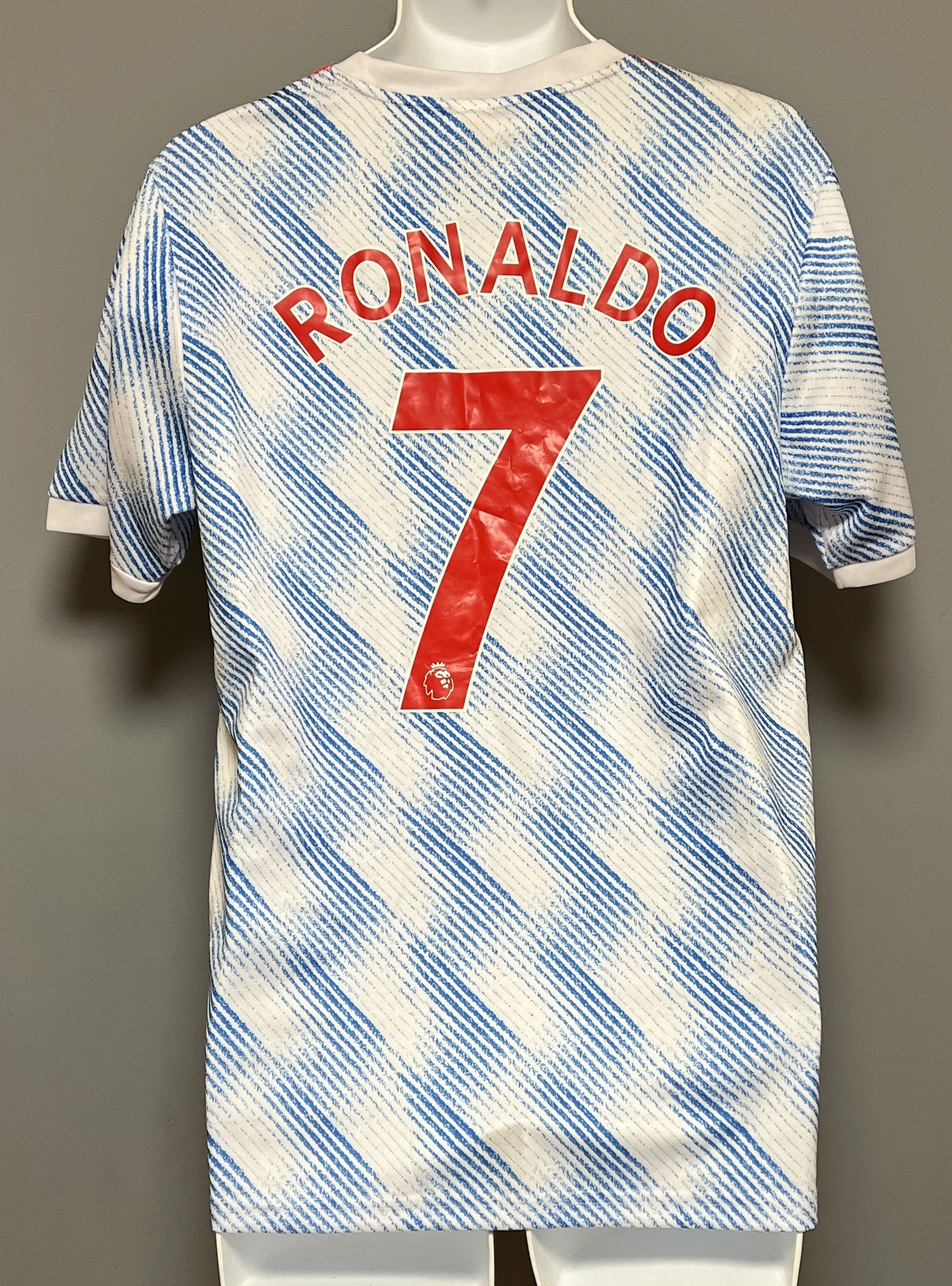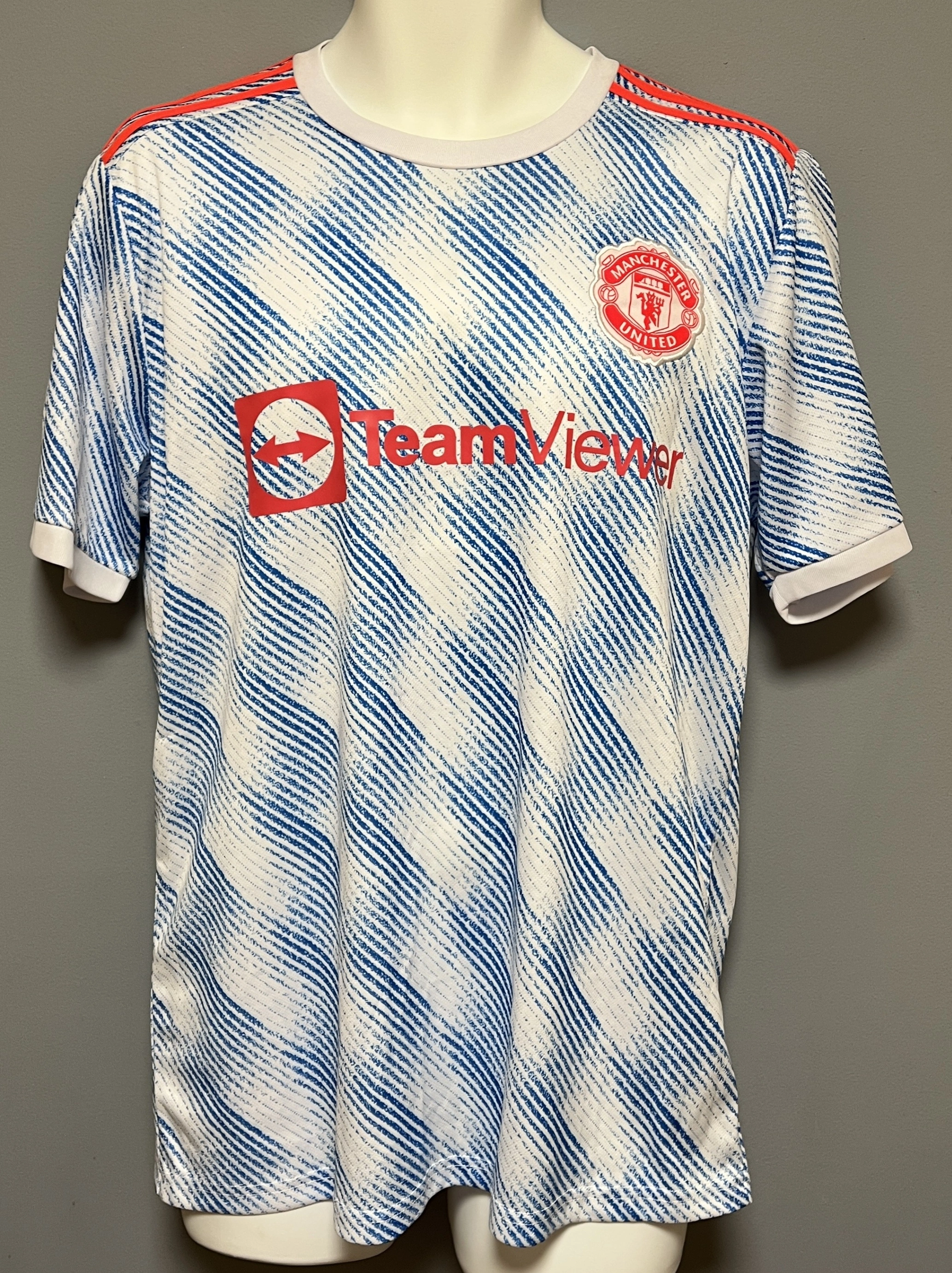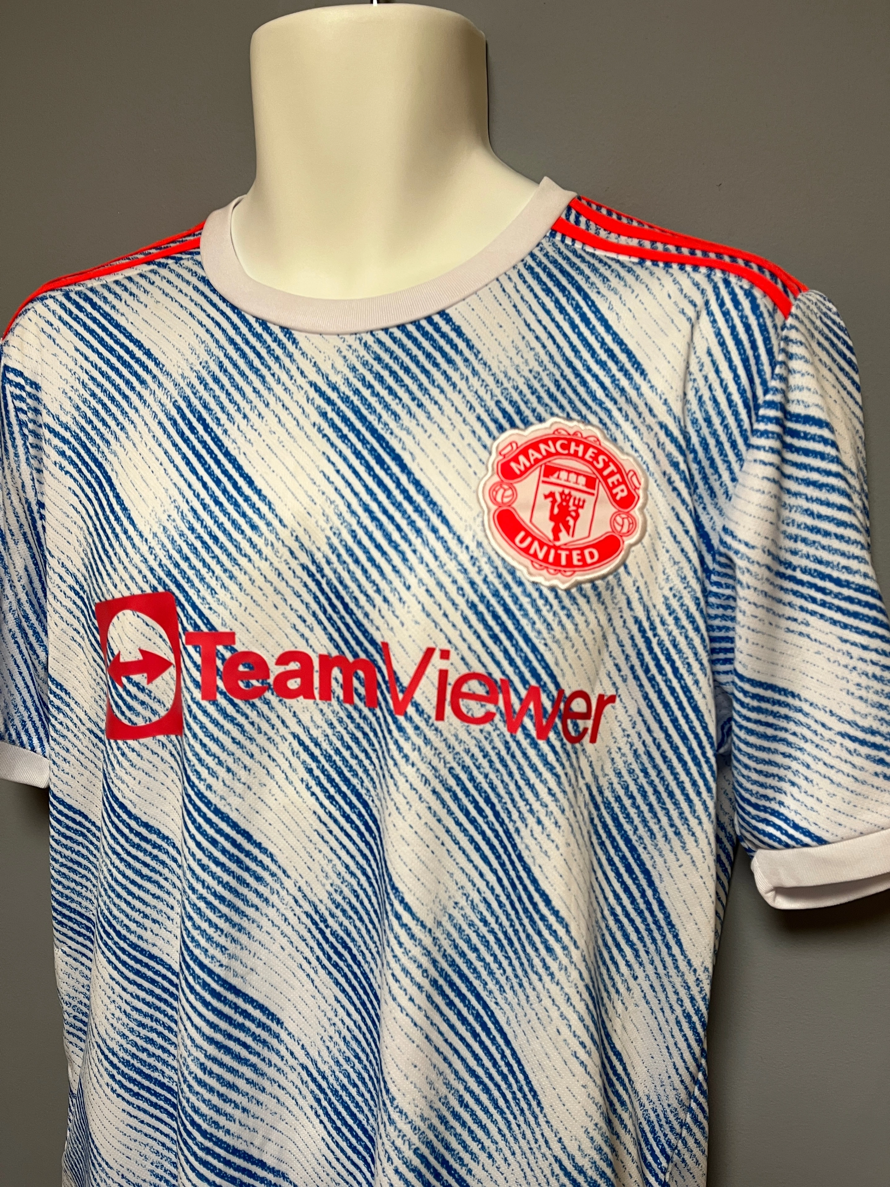Selling a Manchester United jersey with Ronaldo's name and number 7 on the back! It's a size L and made of 100% polyester. The jersey features the TeamViewer sponsor logo on the front and the Manchester United crest on the chest