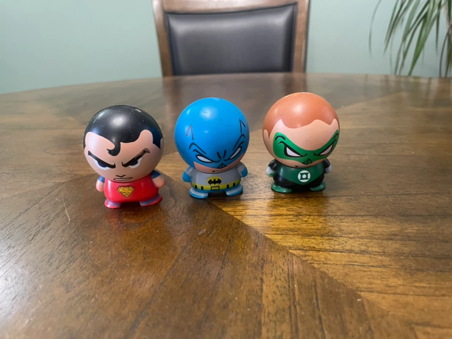 Set of three DC Comics character mini-figurines. Includes Superman, Batman, and Green Lantern. These are small, stylized collectible toys.