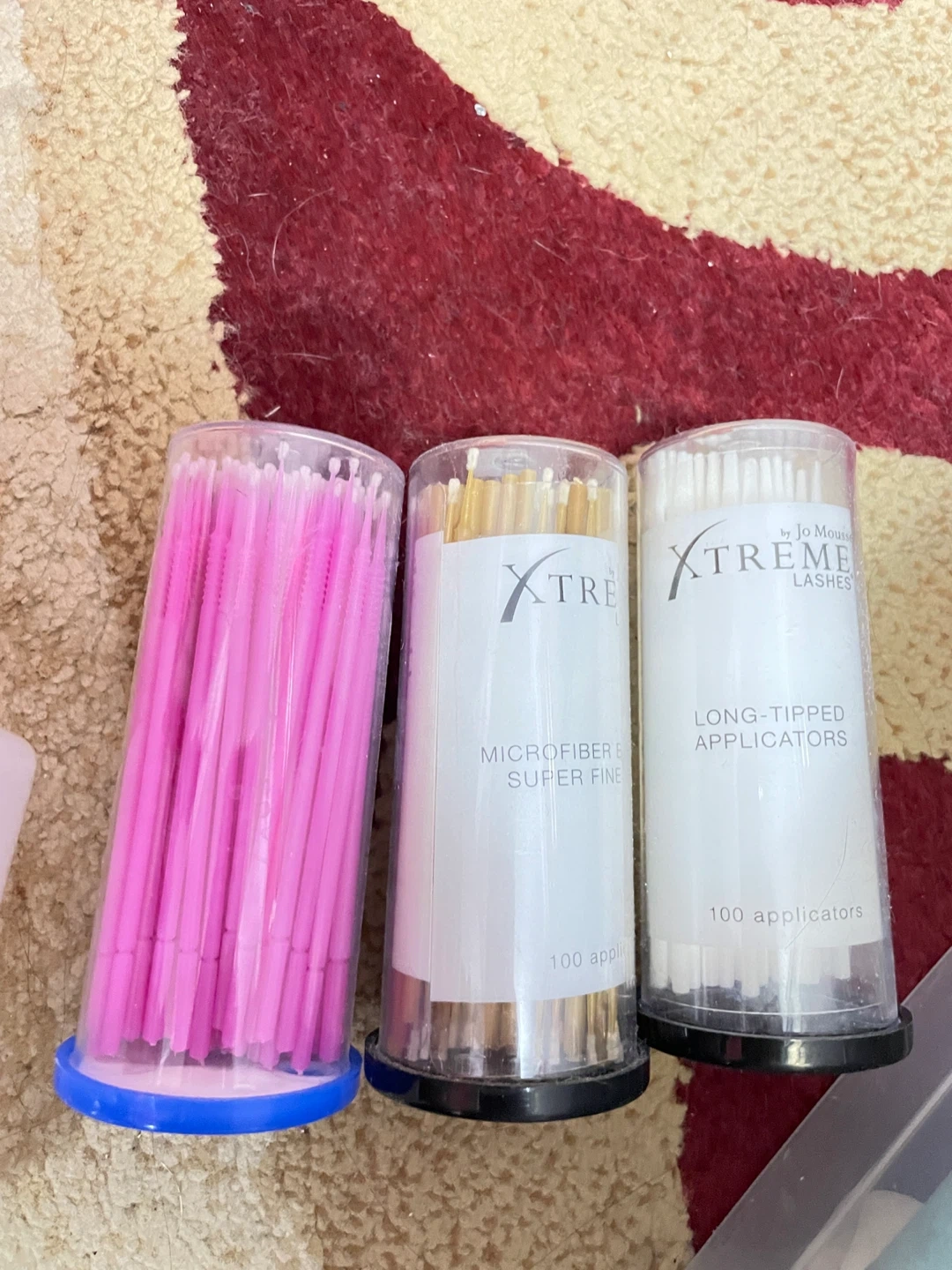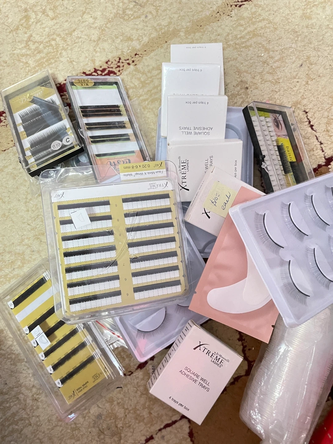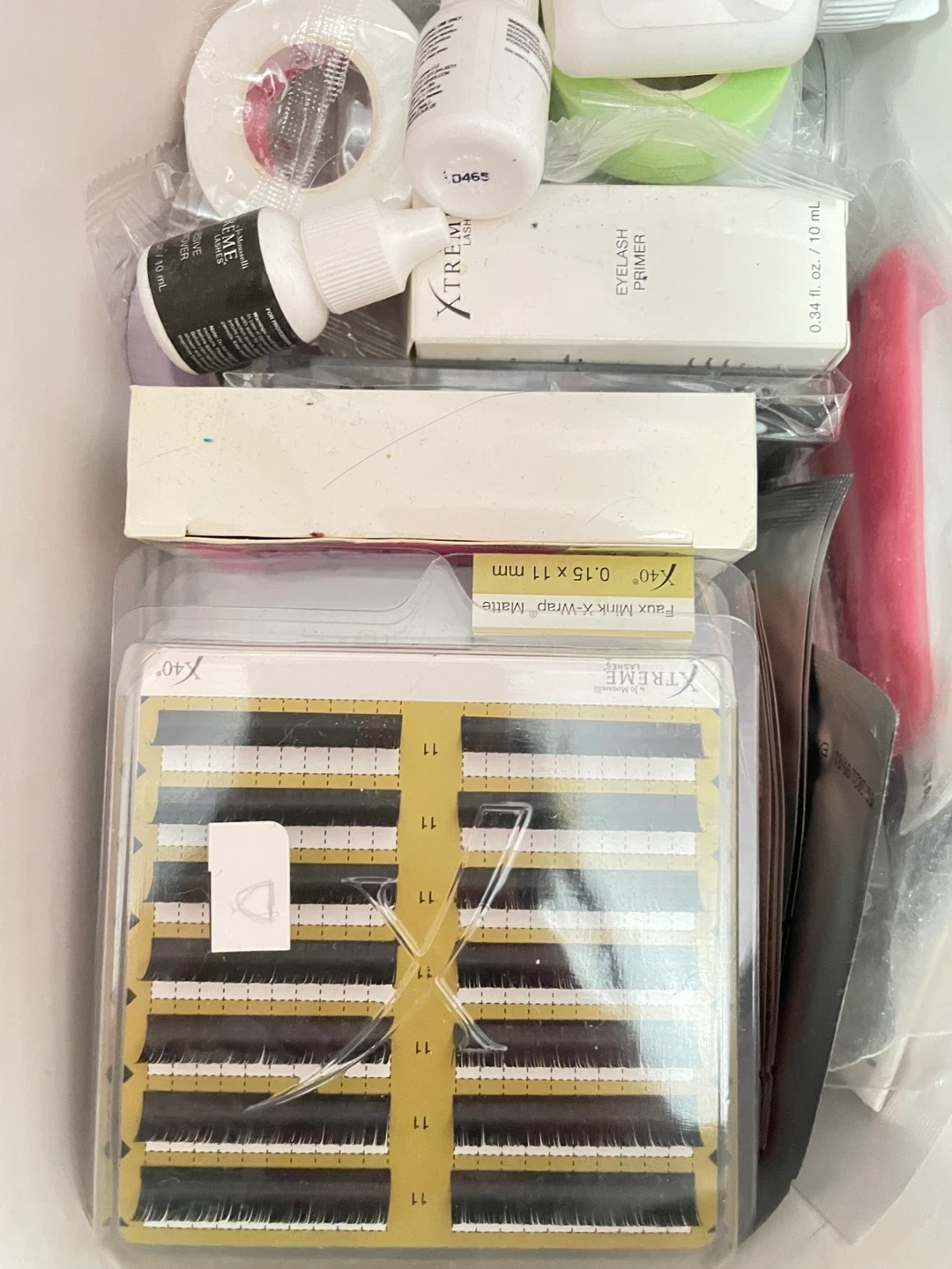 Lot of Xtreme Lashes brand eyelash extension supplies. Includes microfiber applicators, eyelash primer, adhesive trays, and assorted eyelash extensions. Great for lash artists!