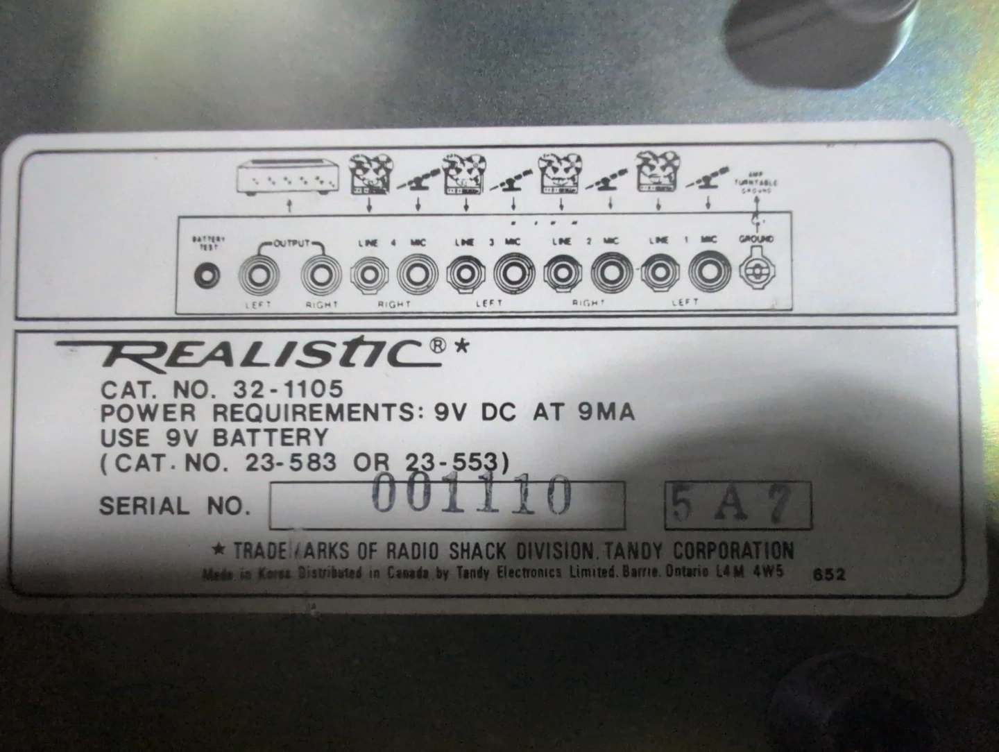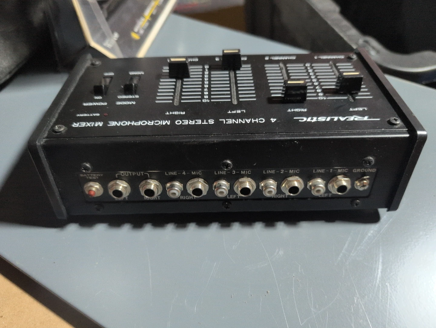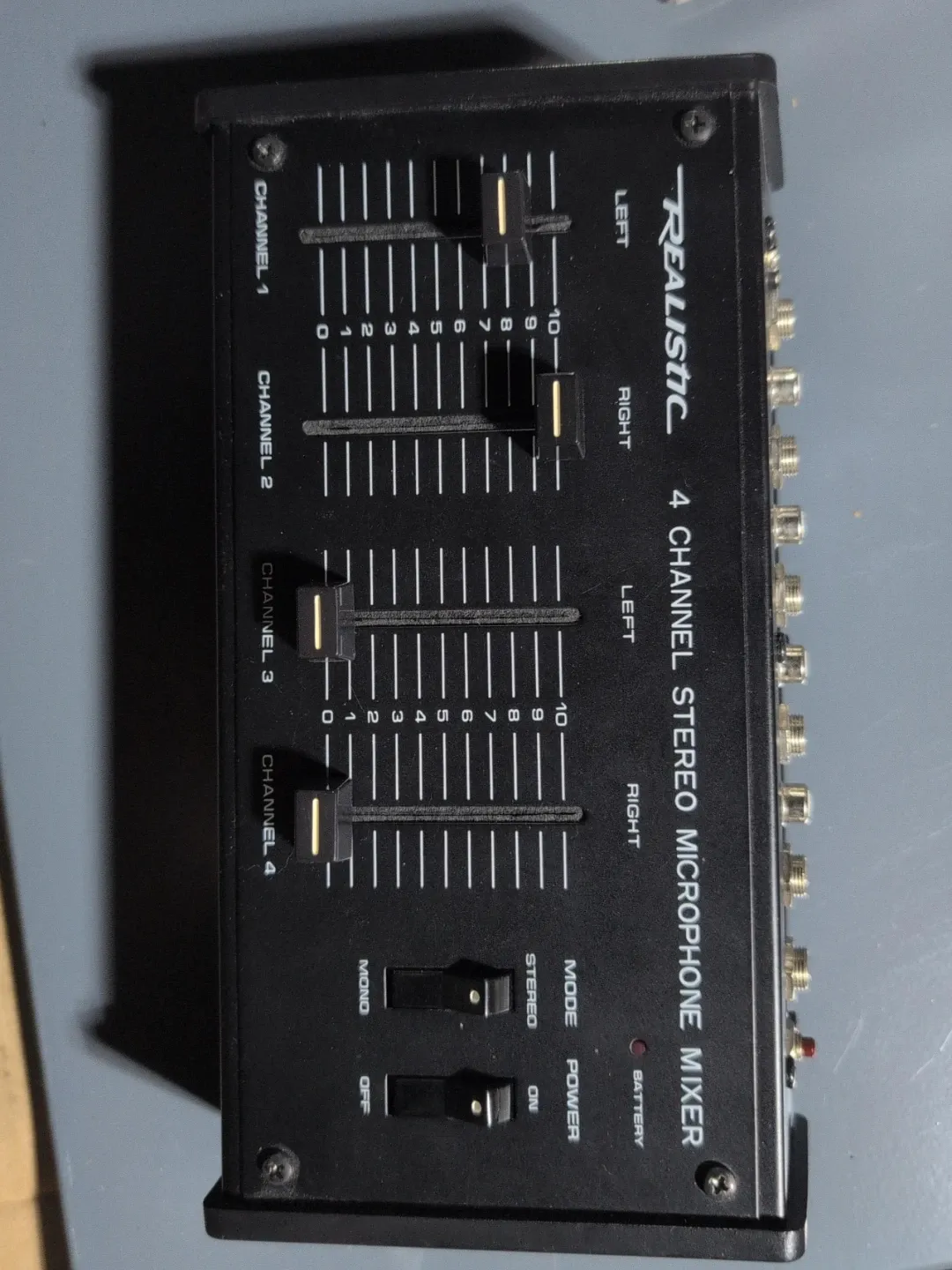 This is a Realistic 4 Channel Stereo Microphone Mixer. It has 4 channels with individual sliders for volume control. Inputs include multiple line and mic options, plus an output. Powered by a 9V battery.