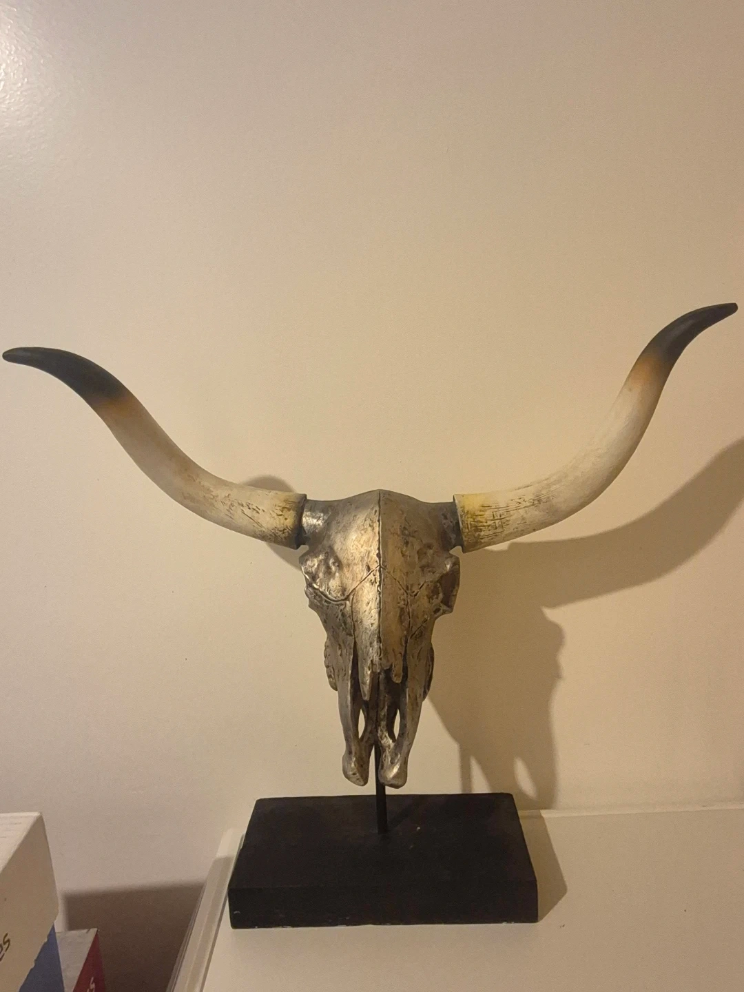 This faux longhorn bull skull is a striking piece for any wall. It's mounted on a sturdy black stand. The skull has a metallic silver finish with aged detailing and realistic horns.