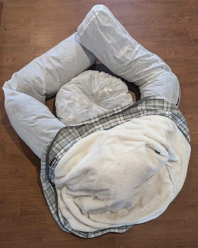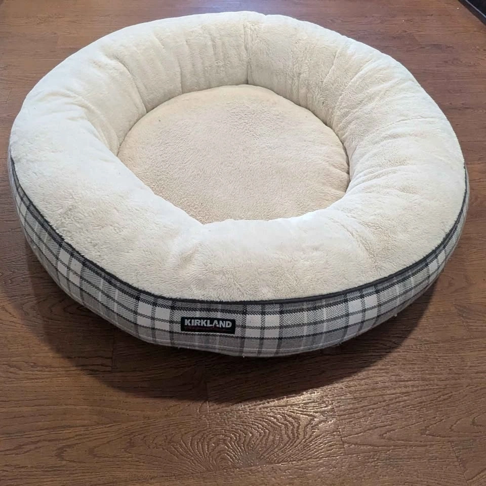 This 40" Kirkland round dog bed comes with removable, washable covers and a reversible, removable insert. The insert has never been used, as my dogs preferred the bed without it. It has been washed already.