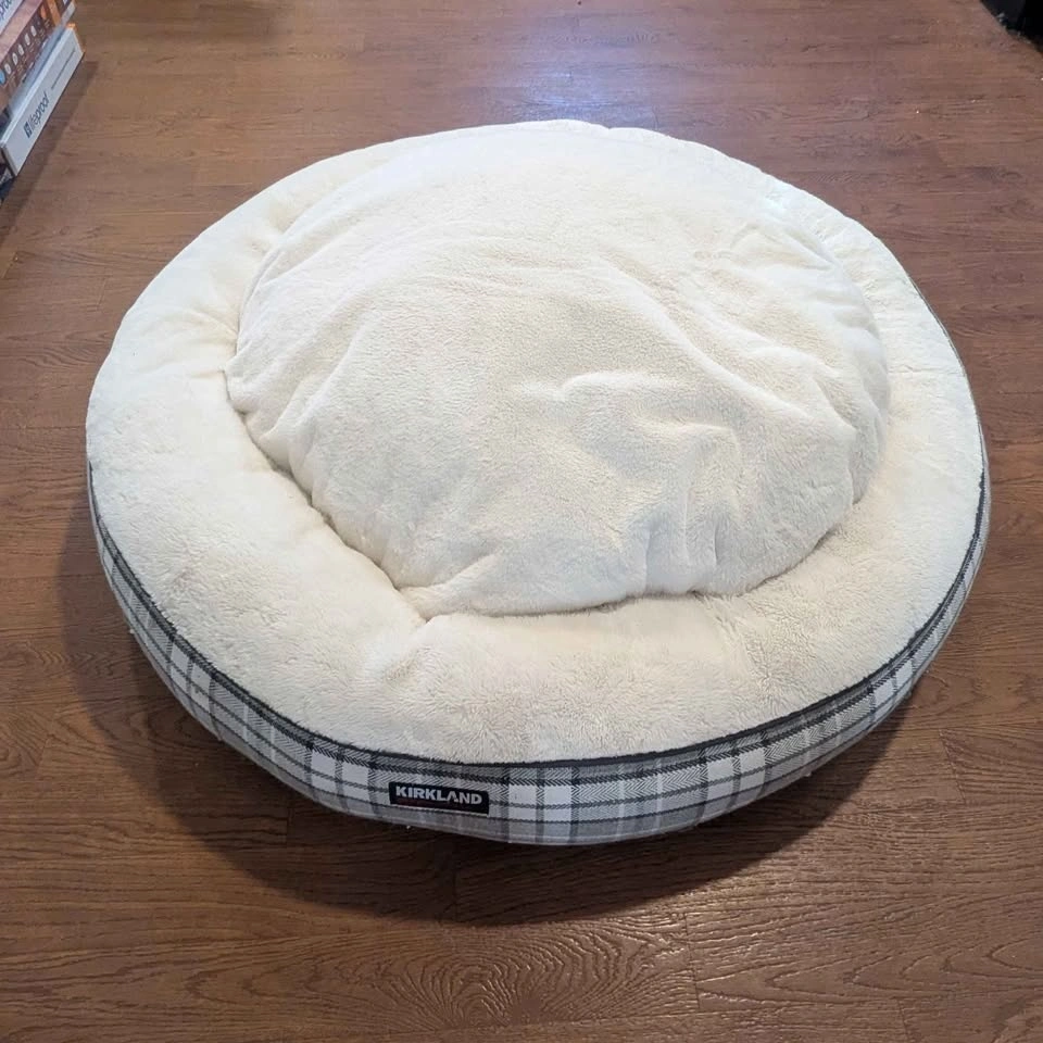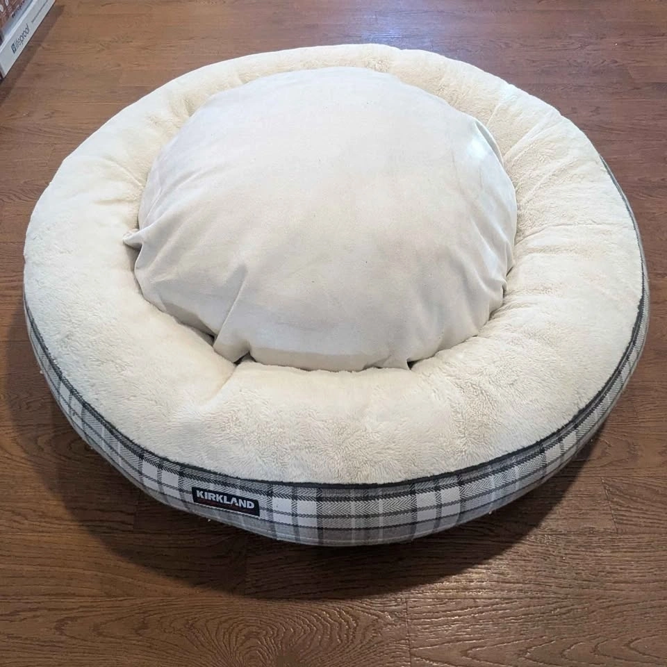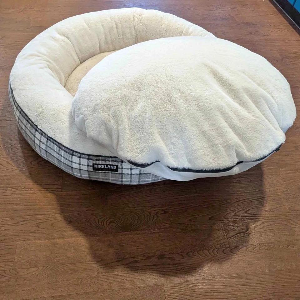 This 40" Kirkland round dog bed comes with removable, washable covers and a reversible, removable insert. The insert has never been used, as my dogs preferred the bed without it. It has been washed already.