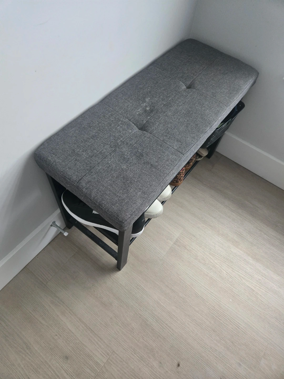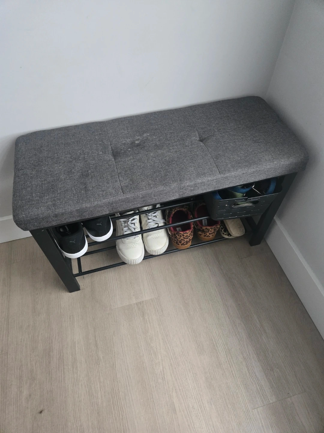 This upholstered bench offers comfortable seating and convenient shoe storage. It's perfect for entryways or mudrooms, keeping your footwear organized and out of the way. The bench features a tufted grey fabric top and a sturdy metal rack below.