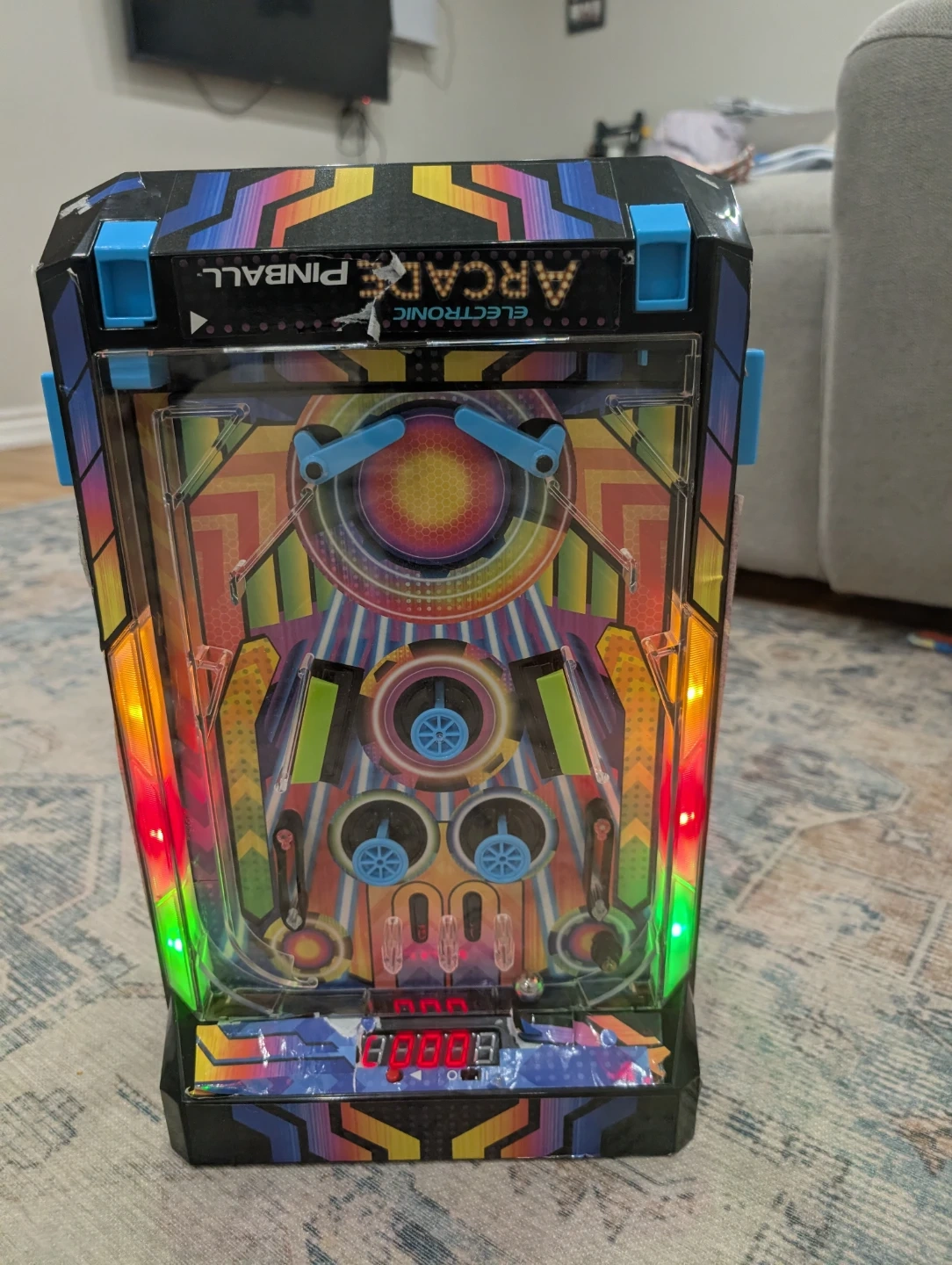 This electronic arcade pinball machine features colourful retro graphics and flashing lights. It has a digital score display and multiple targets to hit. Fun for kids and adults alike!