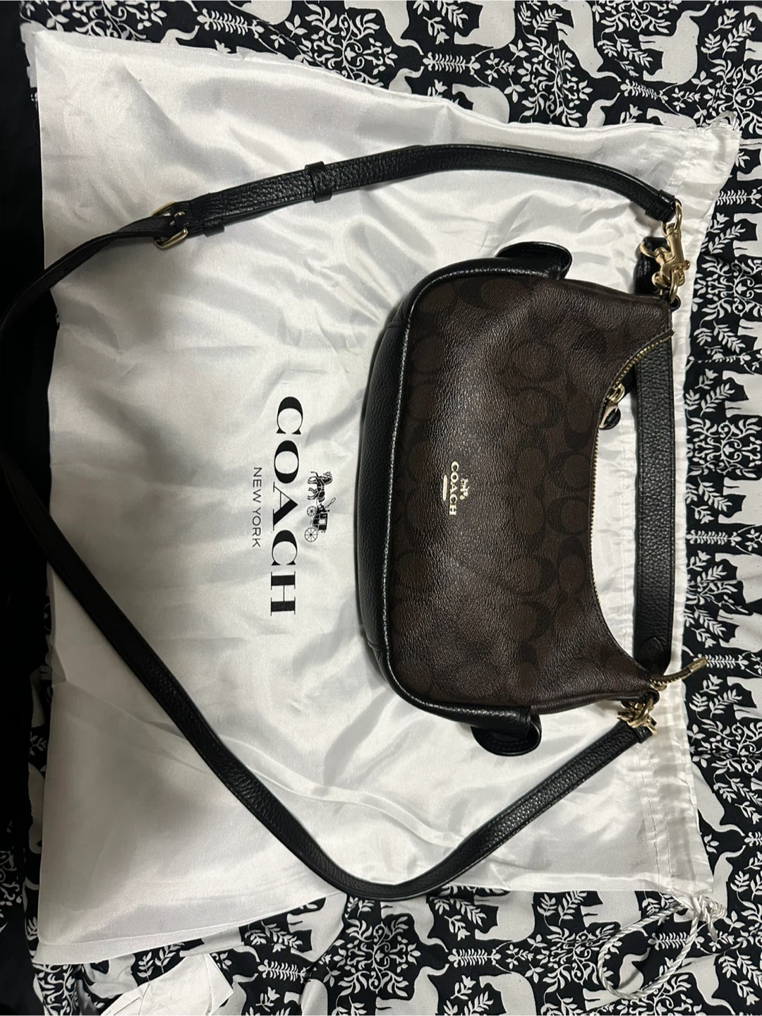 Brown and black Coach shoulder bag with signature "C" pattern. It features gold hardware and a zip closure. Includes a dust bag.