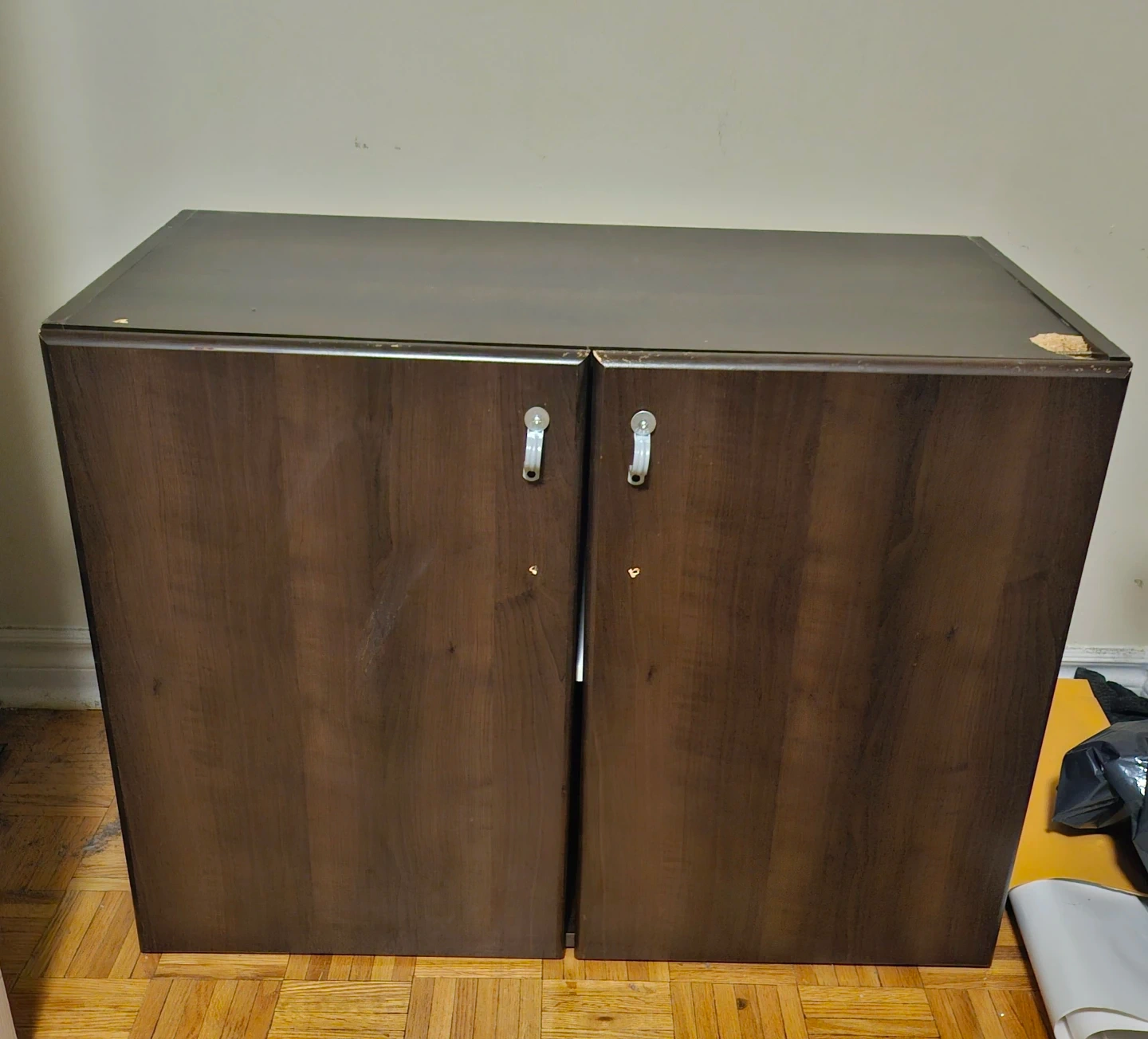 I have 1 floor cabinet, take for free. Good for storing clothes, shoes, etc. 32" l ×17" w ×24" h