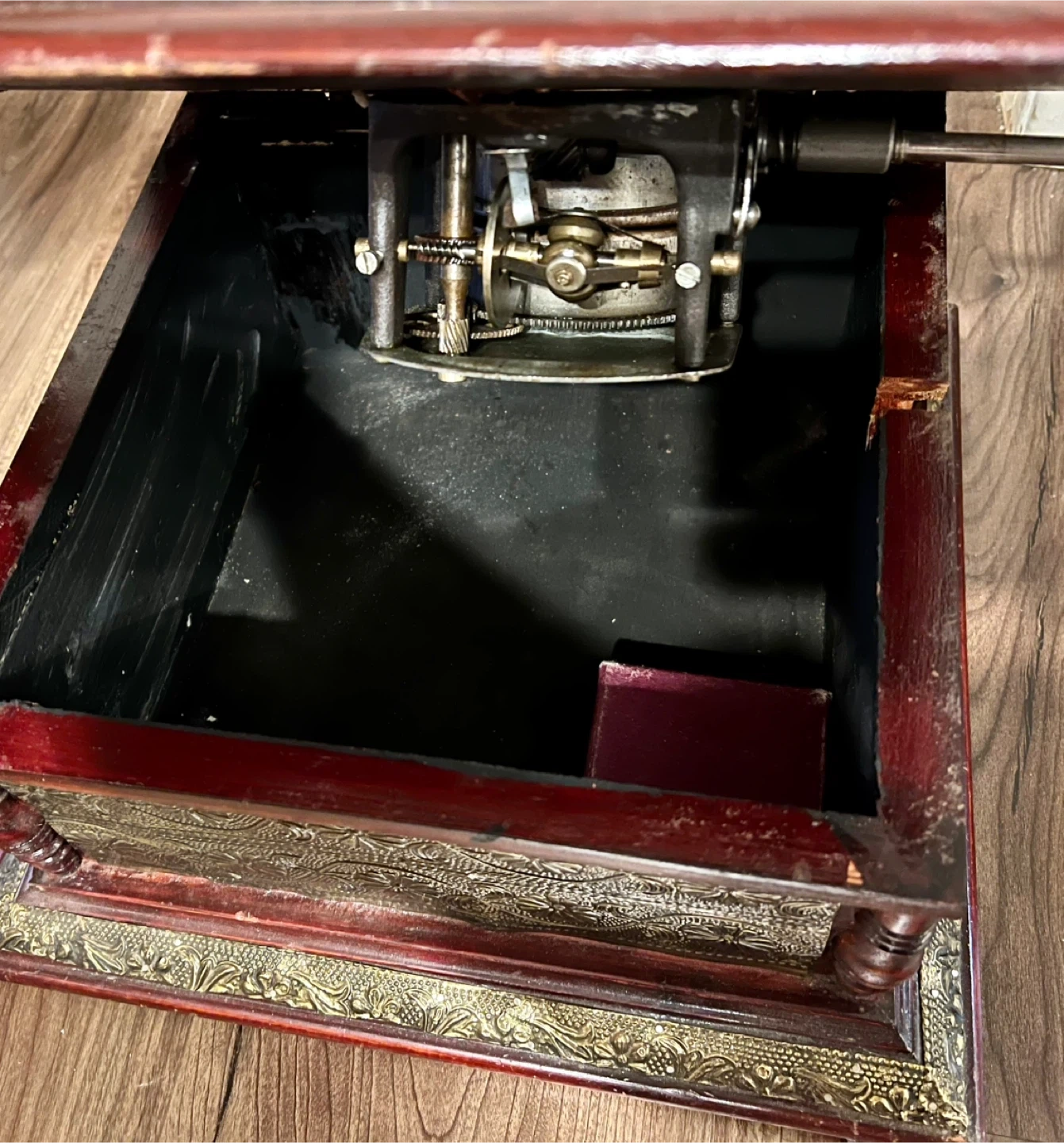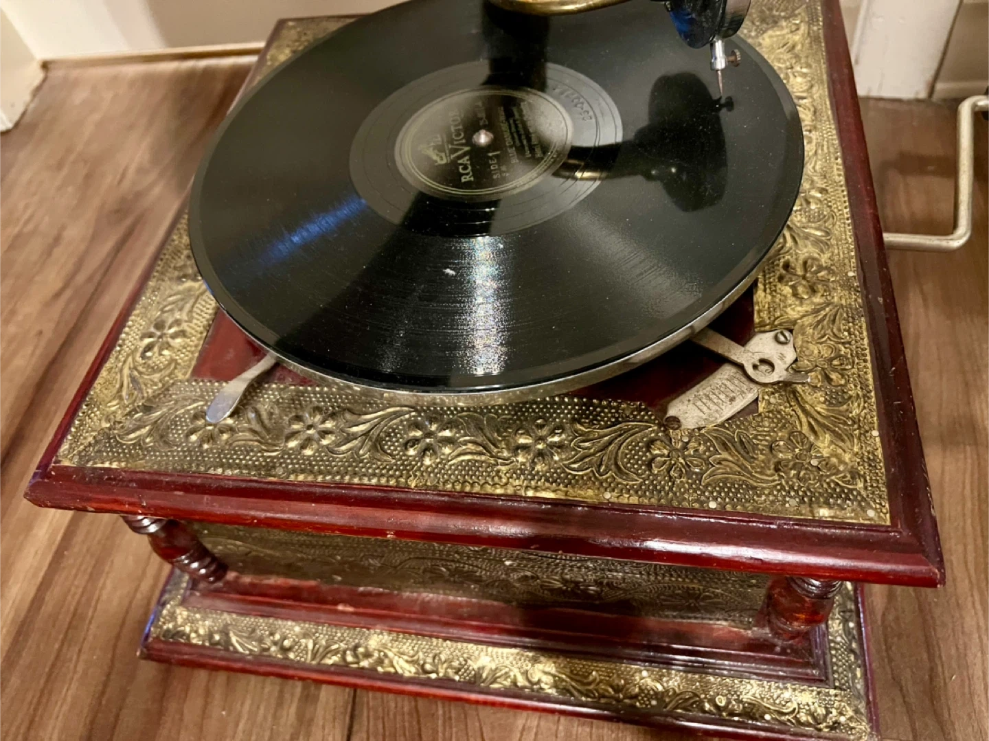 This is a vintage gramophone with a decorative brass horn and a wooden base.