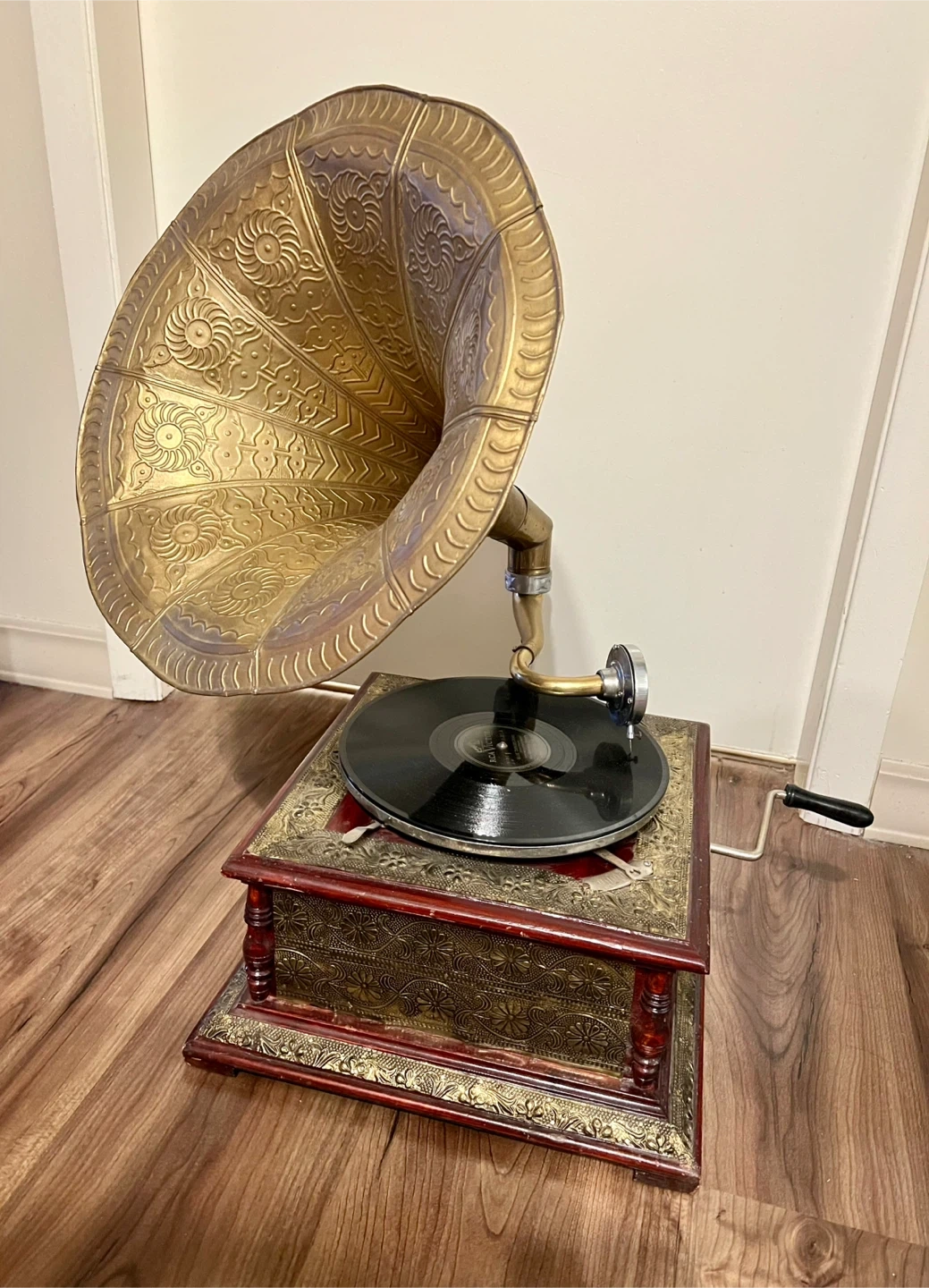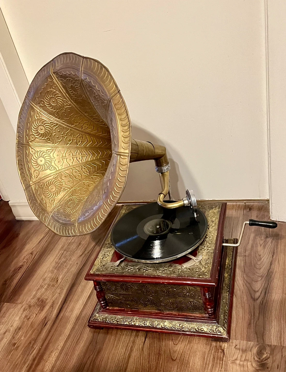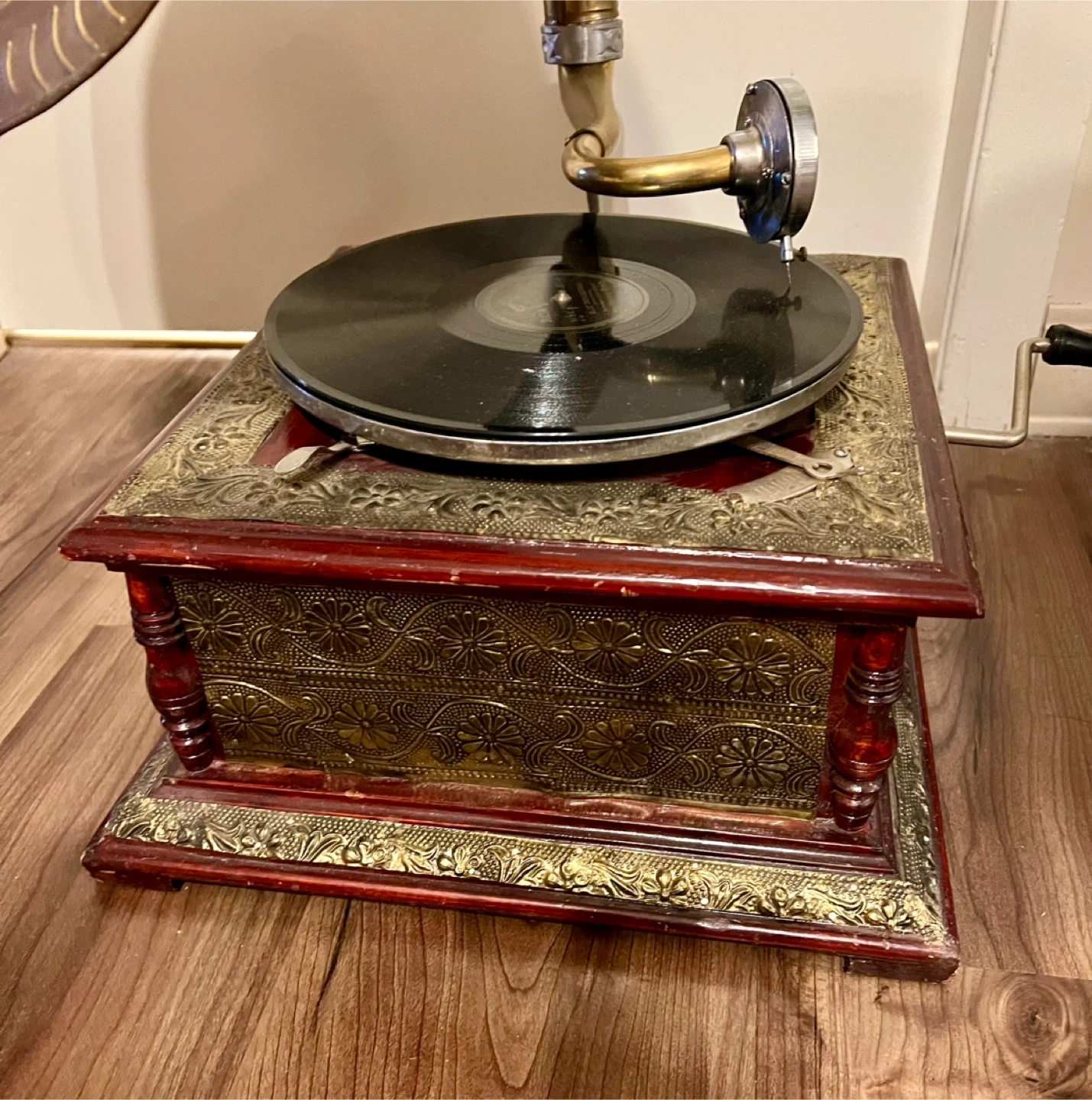This is a vintage gramophone with a decorative brass horn and a wooden base.