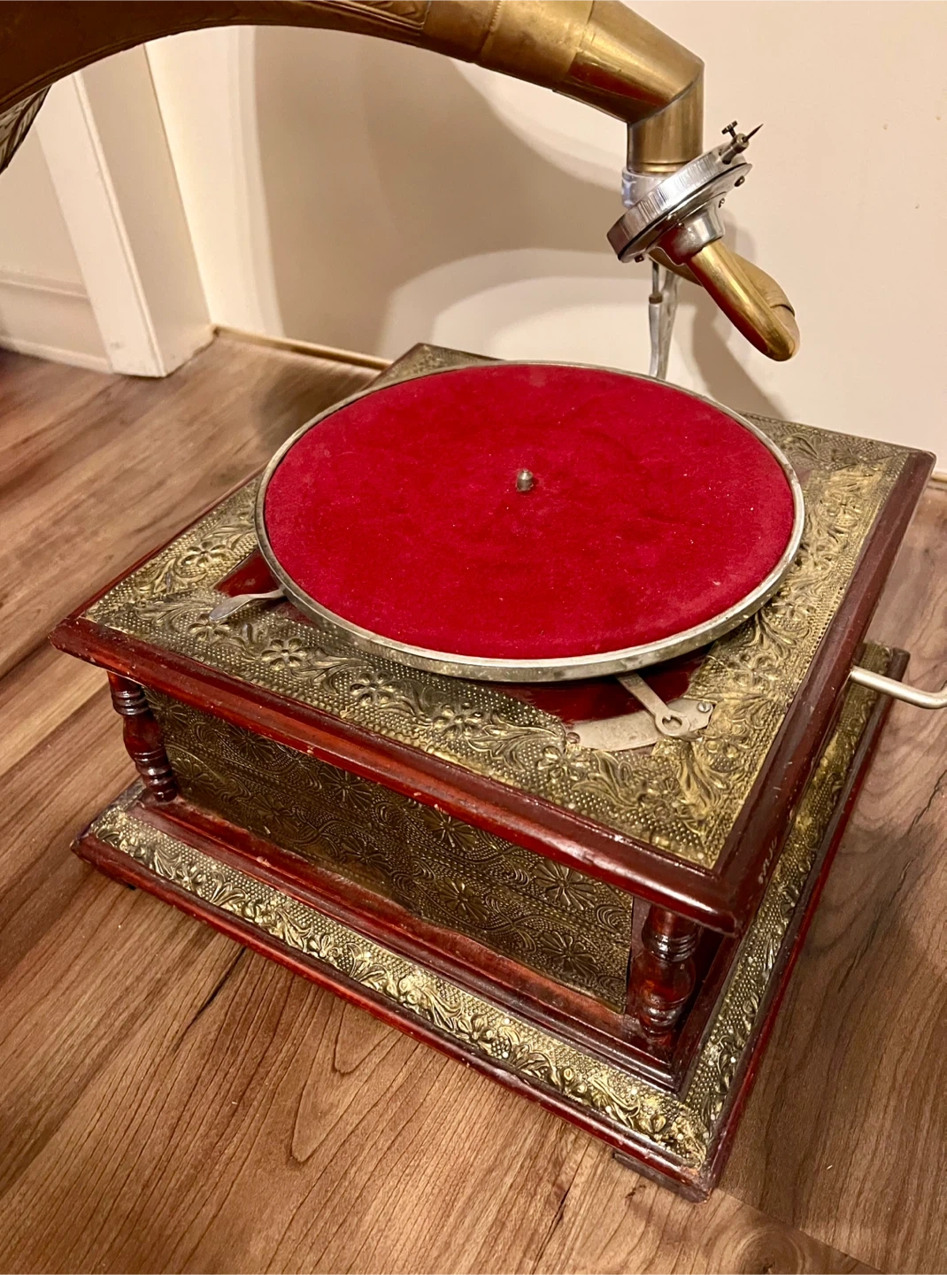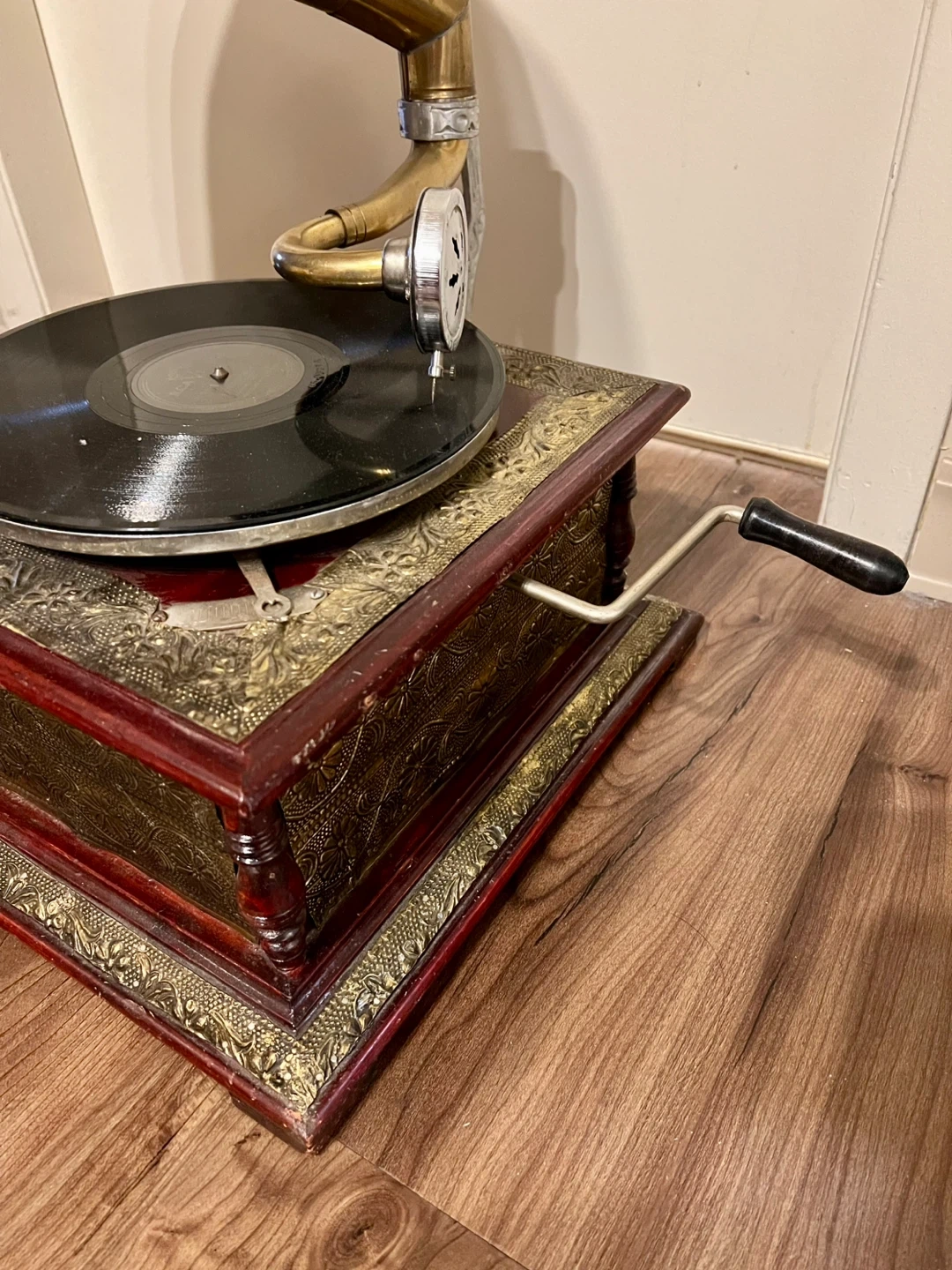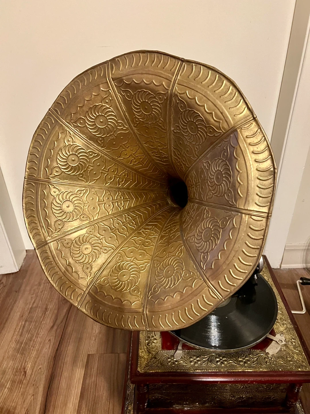 This is a vintage gramophone with a decorative brass horn and a wooden base.