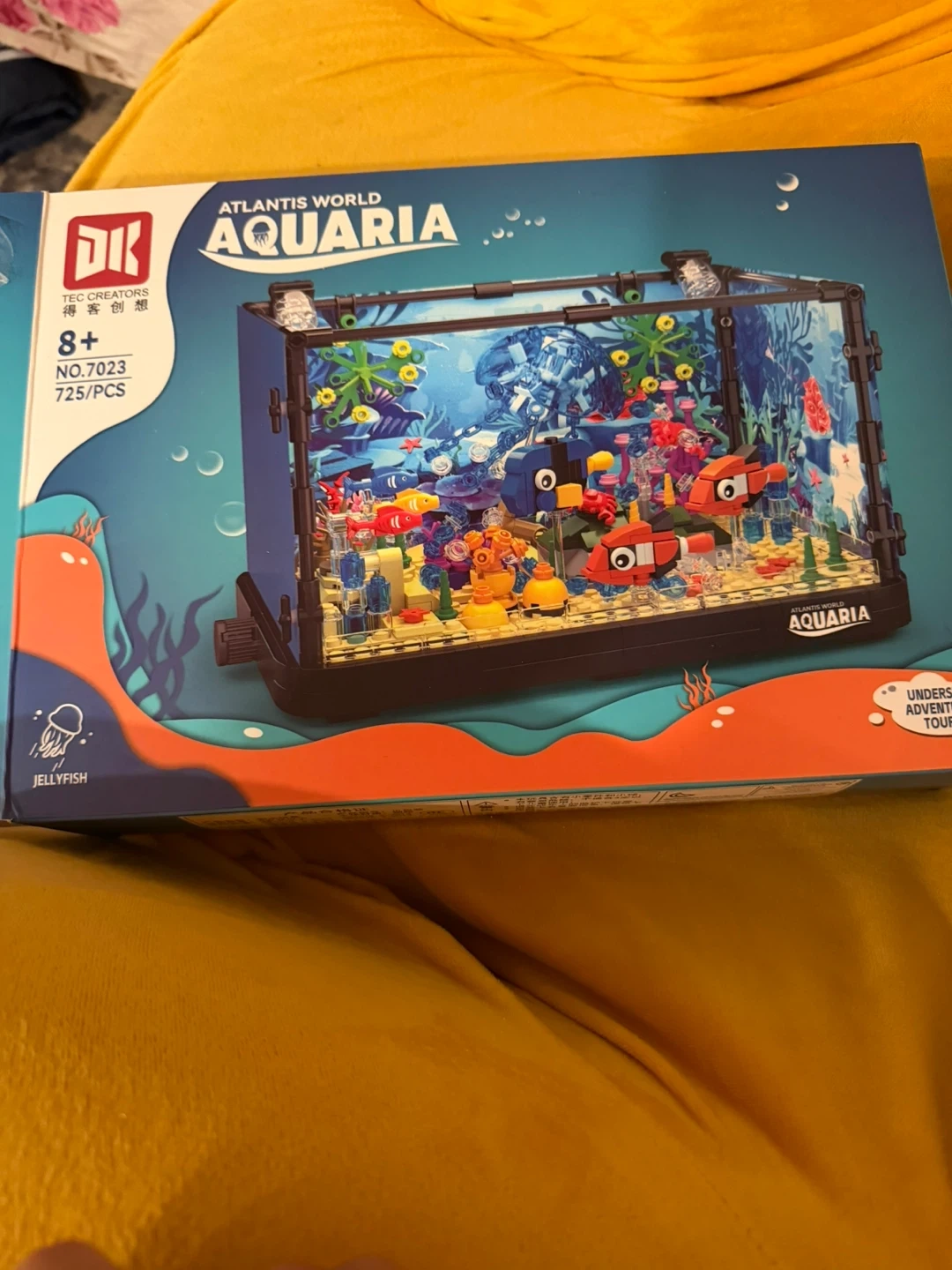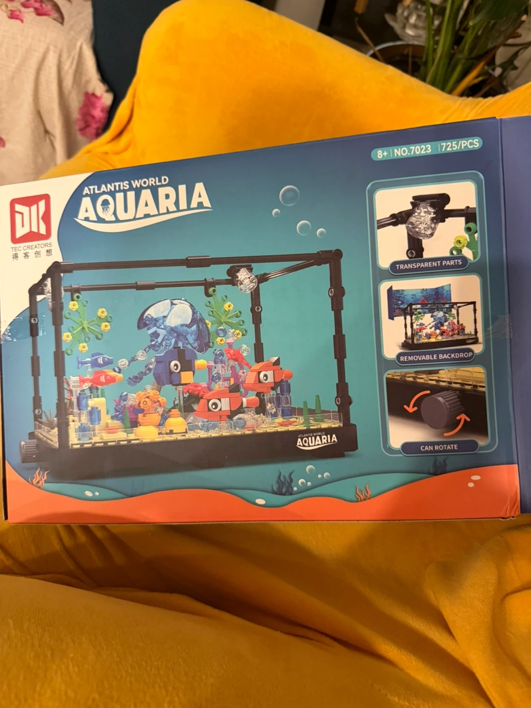 This building block set features an underwater aquaria theme. It includes transparent parts and a removable backdrop. It's suitable for ages 8+ and contains 725 pieces.