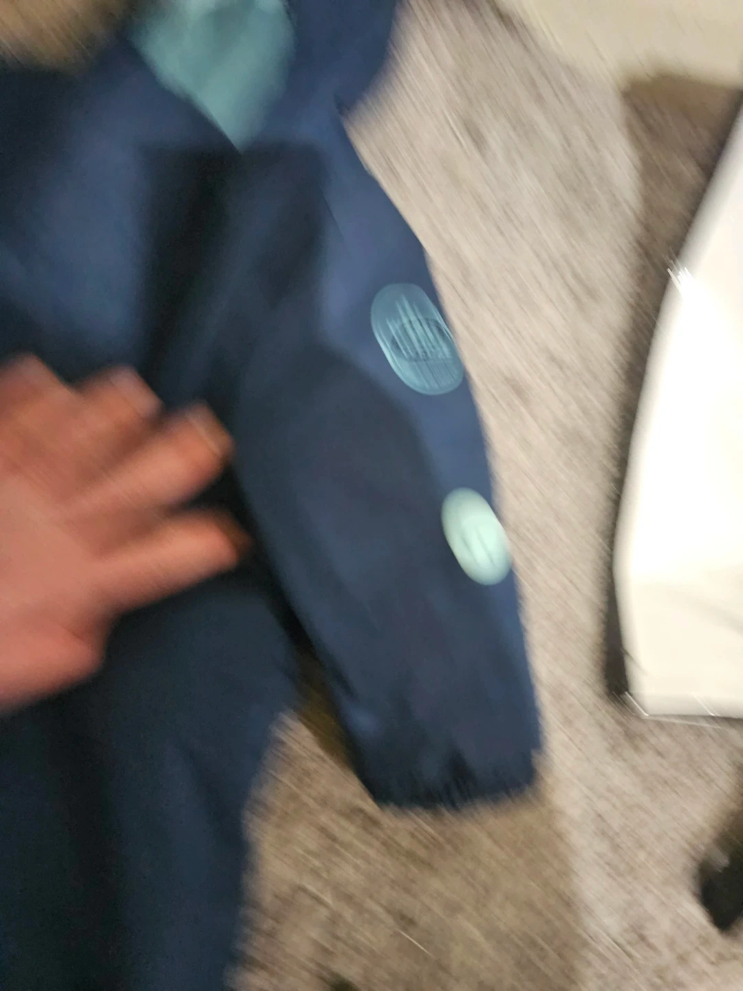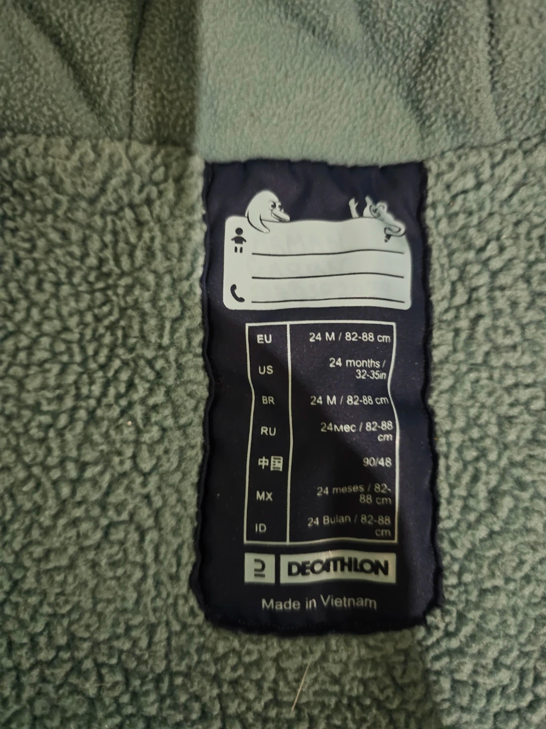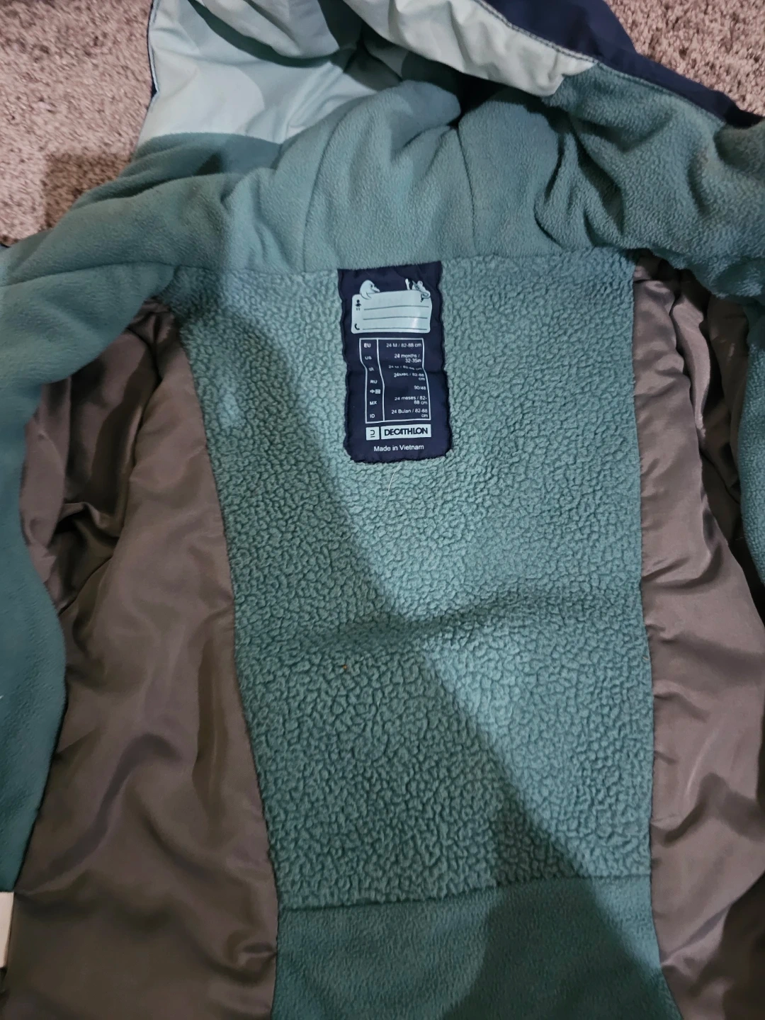 A warm, insulated snowsuit by Wedze and Decathlon. It's navy blue with a fuzzy teal lining. This snowsuit is sized for 24 months or 82-88 cm. It's perfect for keeping little ones toasty during winter adventures!