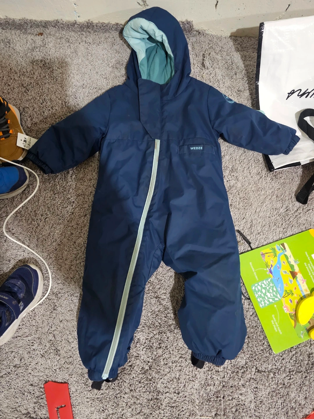 A warm, insulated snowsuit by Wedze and Decathlon. It's navy blue with a fuzzy teal lining. This snowsuit is sized for 24 months or 82-88 cm. It's perfect for keeping little ones toasty during winter adventures!