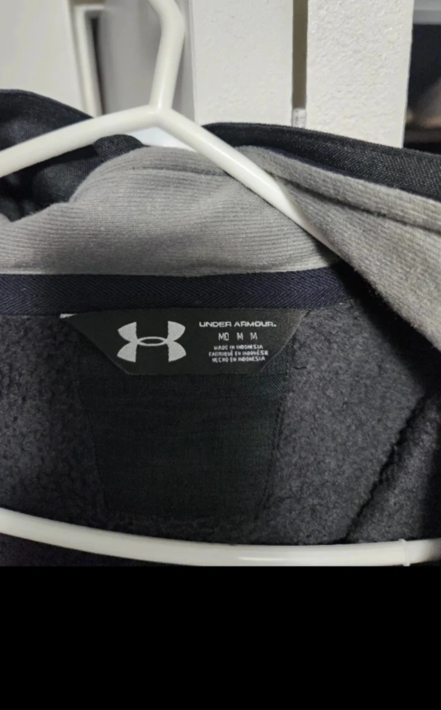 This Under Armour jacket is dark grey and has a full zip closure. It features a hood and a cozy fleece lining. Size medium.