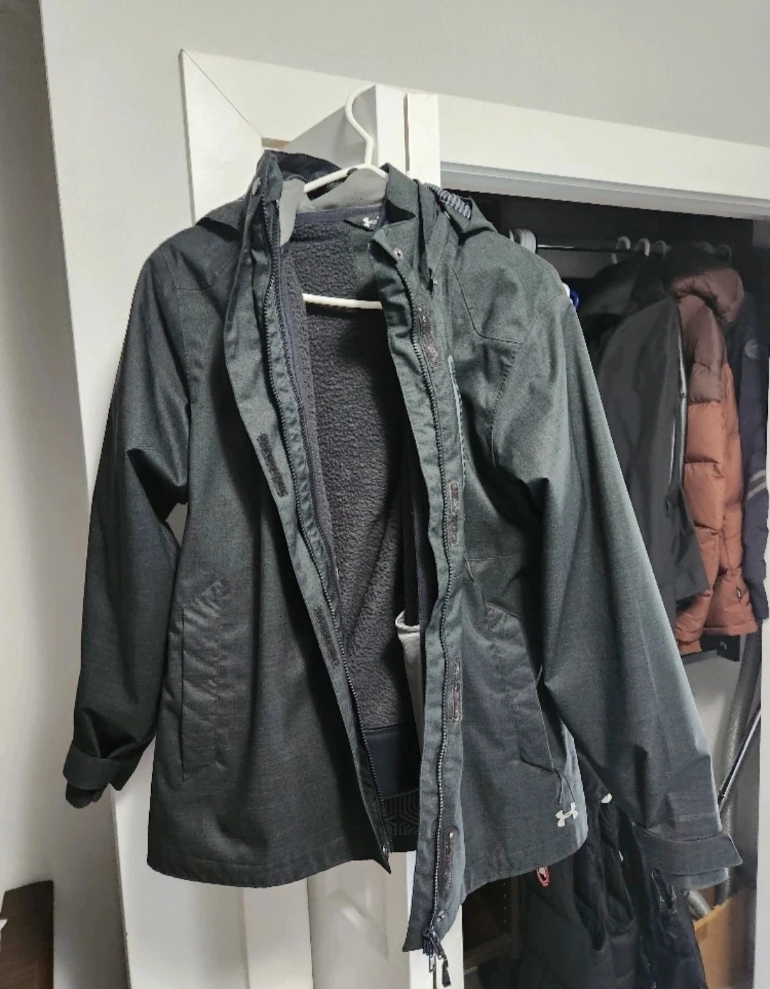 This Under Armour jacket is dark grey and has a full zip closure. It features a hood and a cozy fleece lining. Size medium.