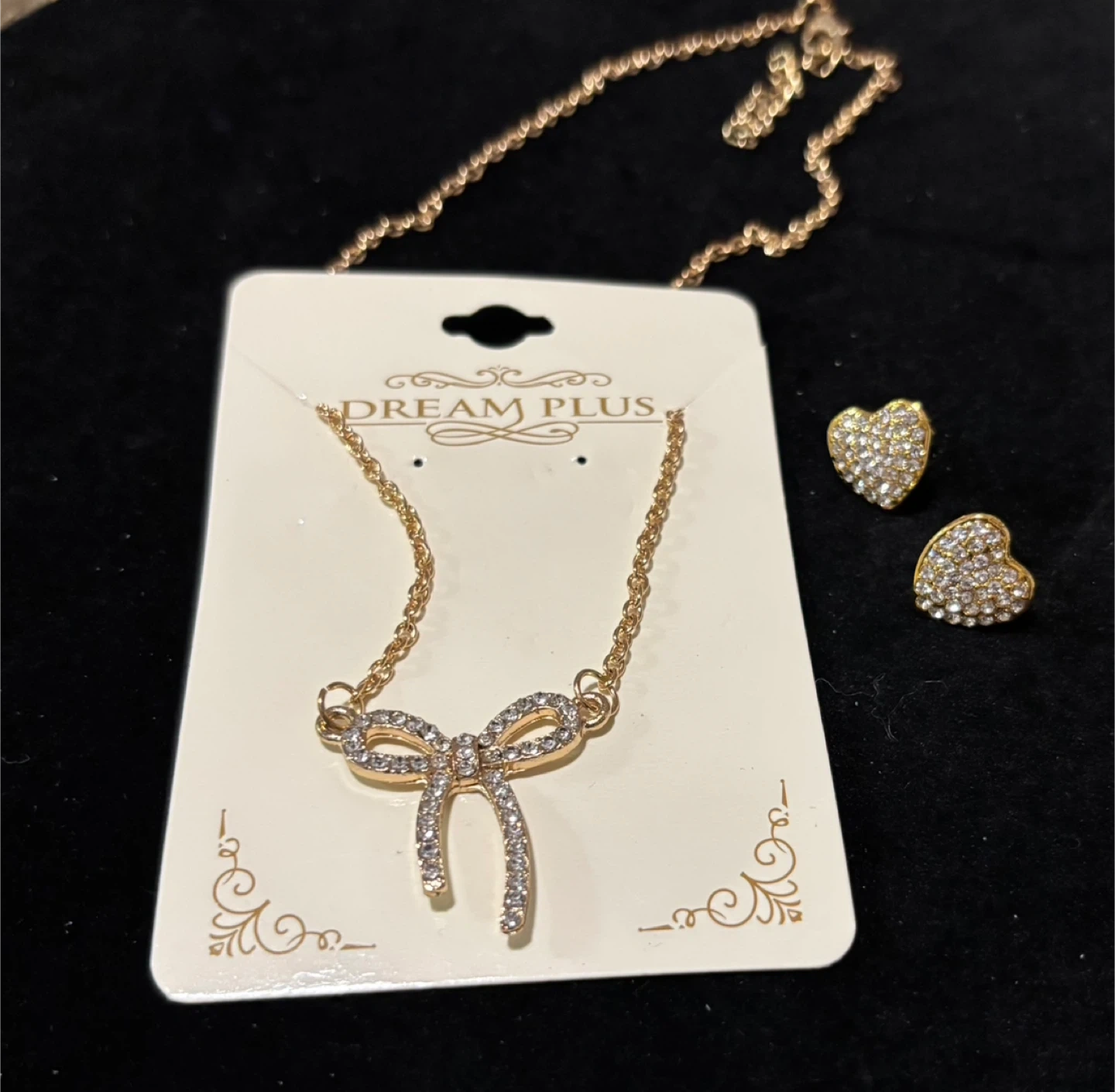This is a gold tone necklace and earring set from Dream Plus. The necklace features a sparkling bow pendant. The earrings are heart-shaped and also adorned with sparkle. It's a lovely accessory set!