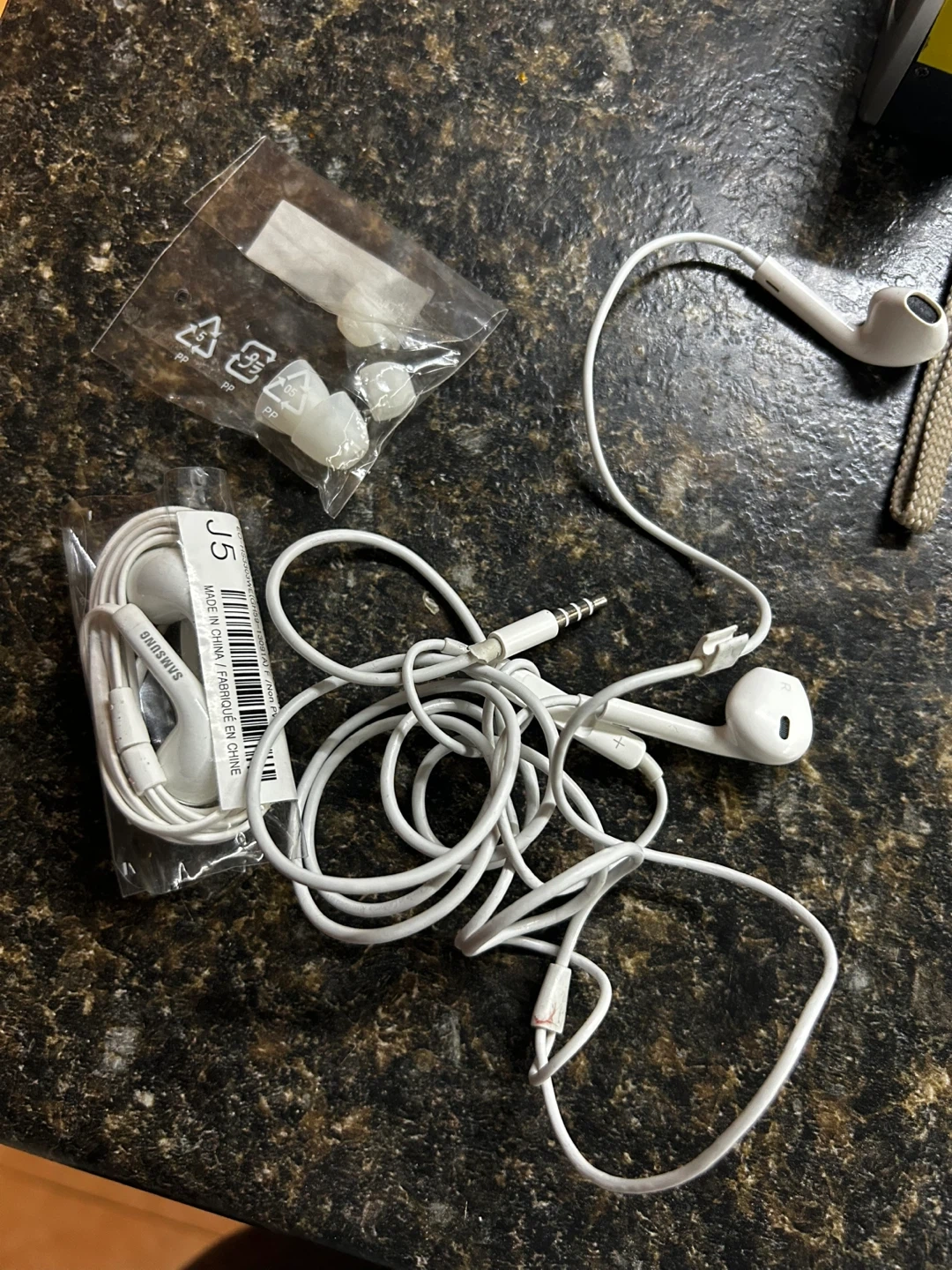 Samsung white wired earphones. Includes extra ear tips in a plastic bag. These are a standard 3.5mm jack wired headset. Used for listening to audio. #freecycle