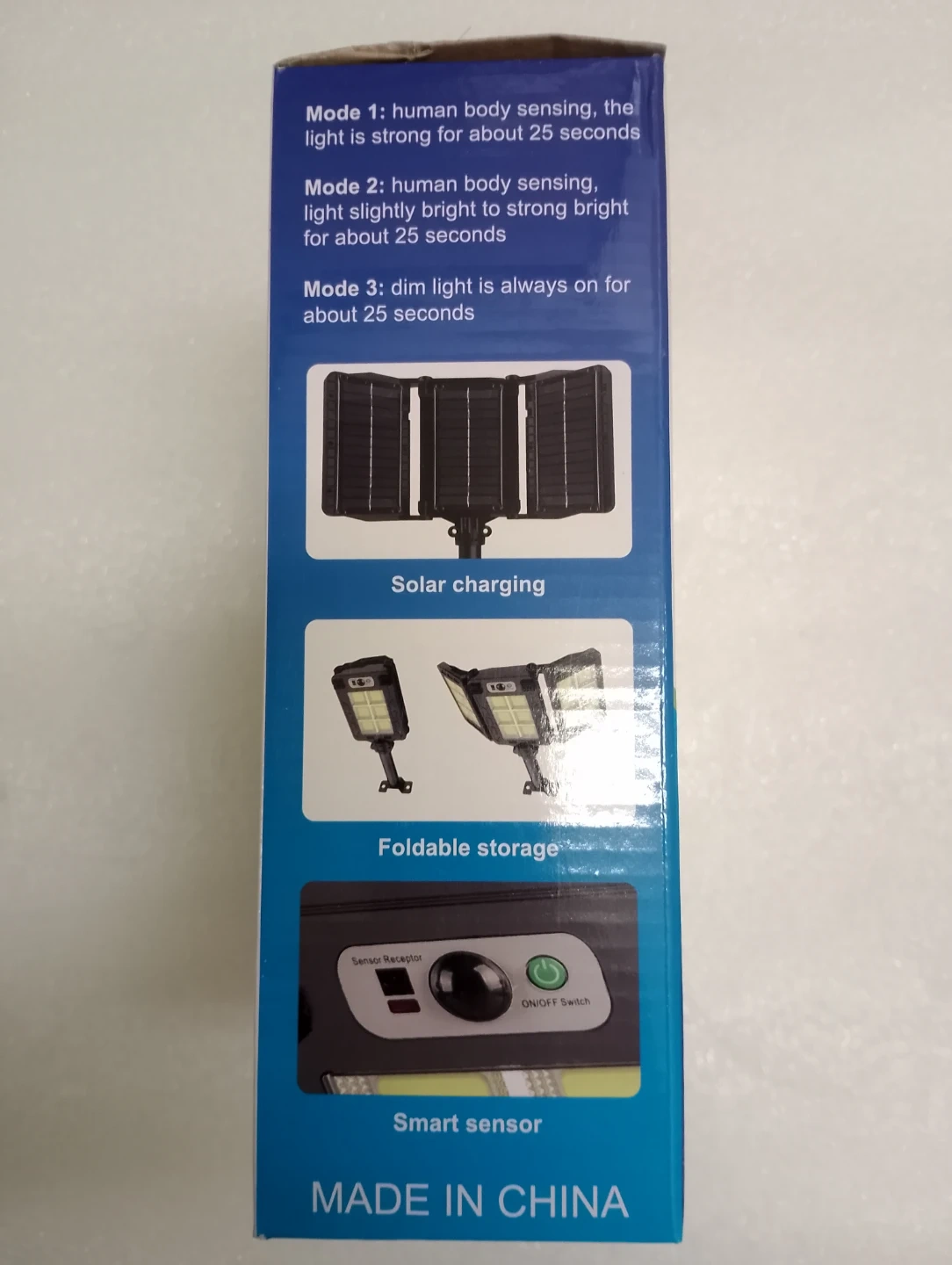 This high-power solar light features a smart sensor and three modes. It offers solar charging, glare lighting, and green energy. The light has modes for human body sensing and dim light. Made in China.